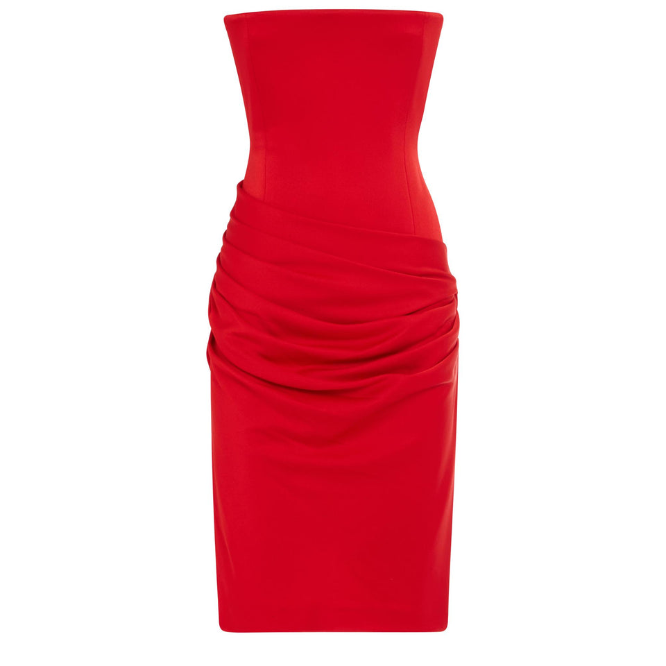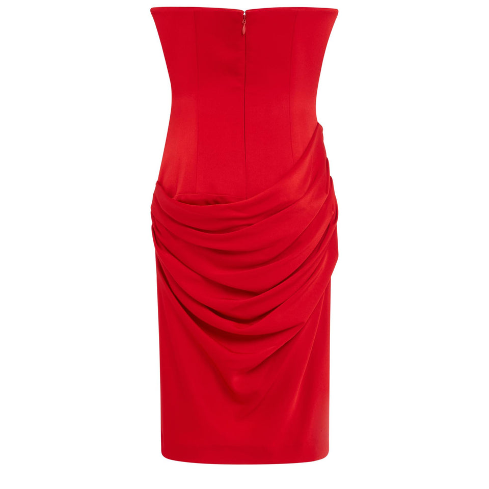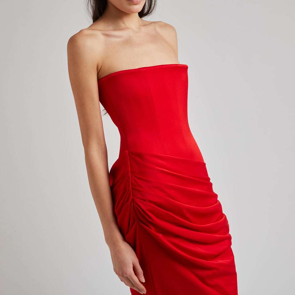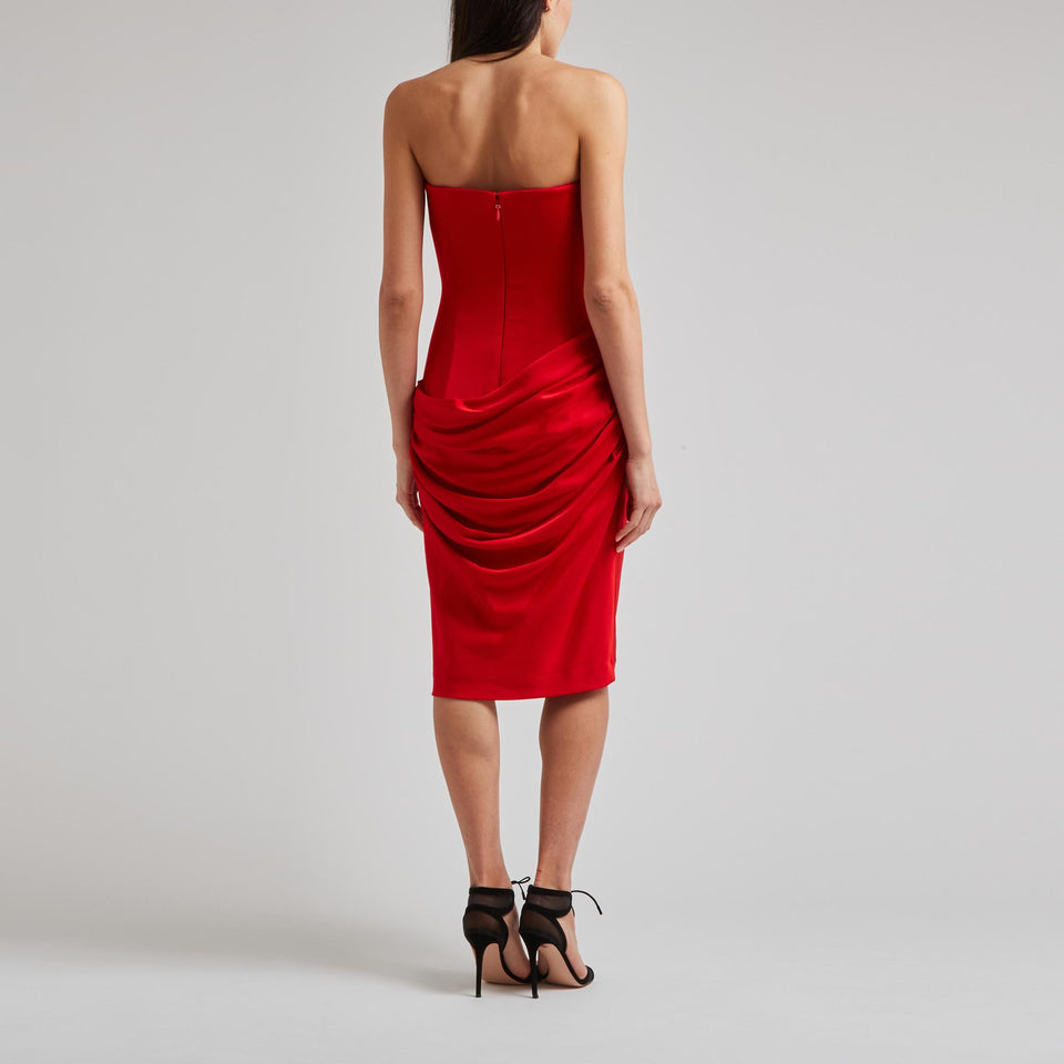 Off-the-shoulder satin dress with drop detail and back zip fastening.