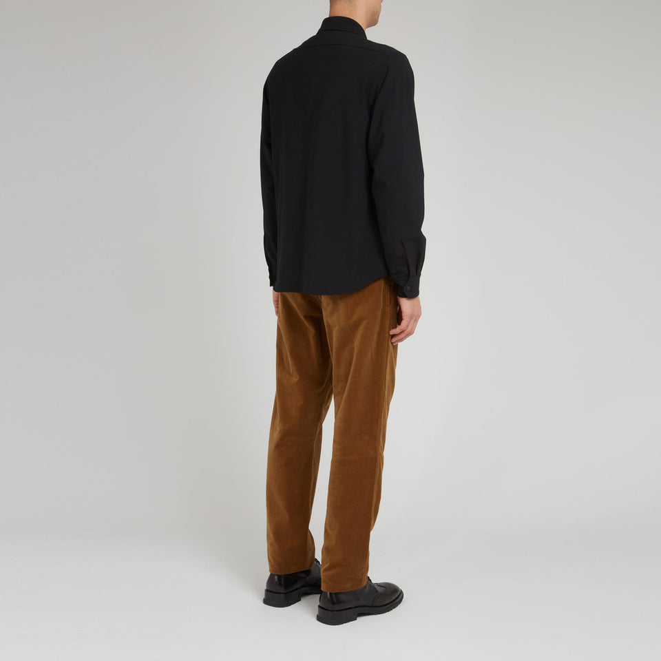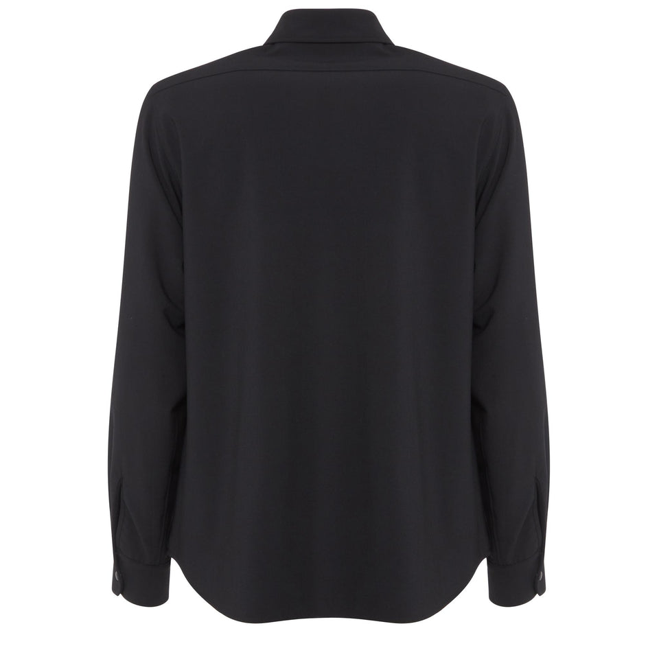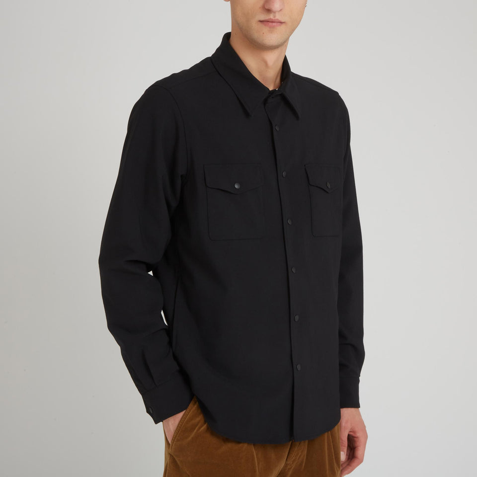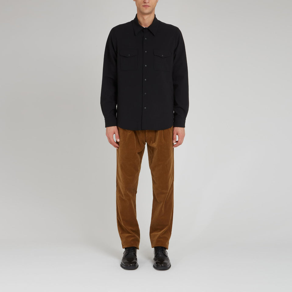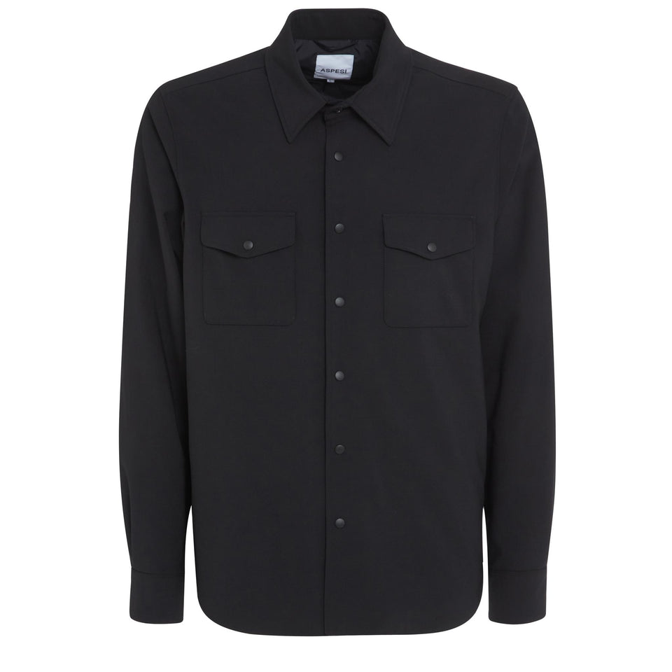 Fabric shirt with long sleeves and collar, two front pockets with flap and snap button closure.