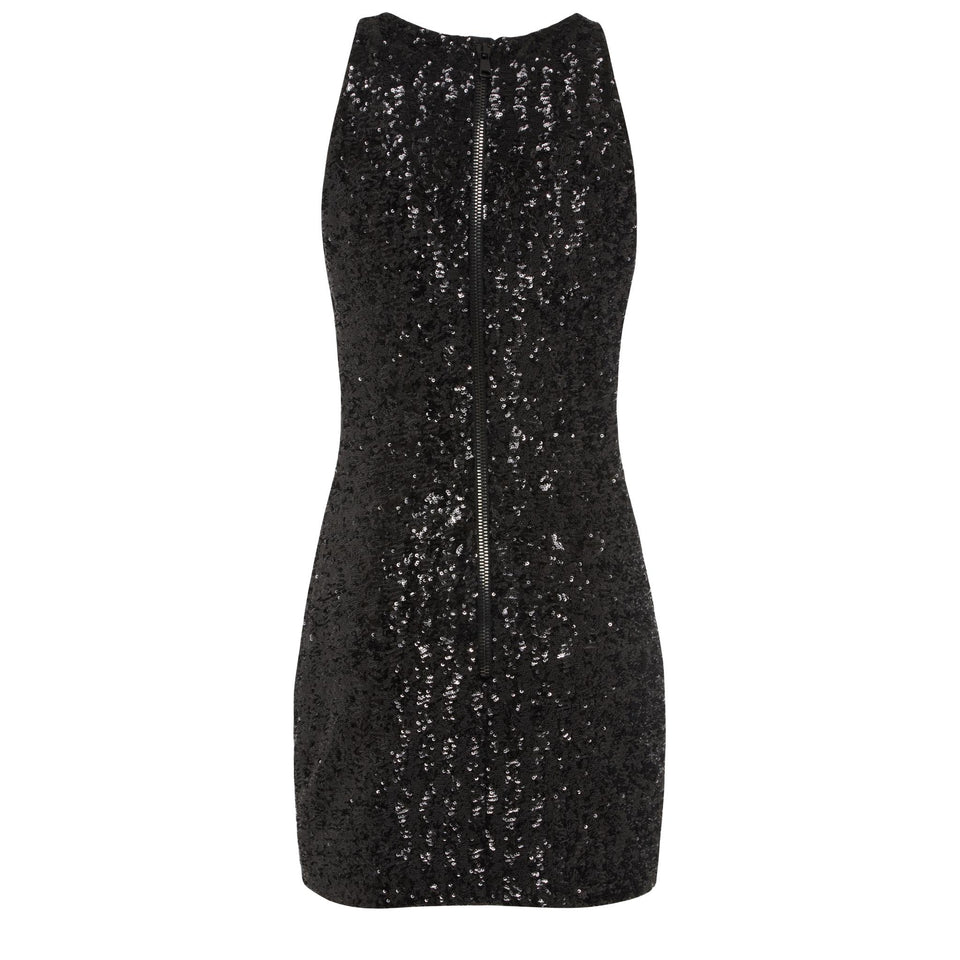 Sleeveless fabric dress with crew neck, front detail with contrasting crystals and back zip closure.