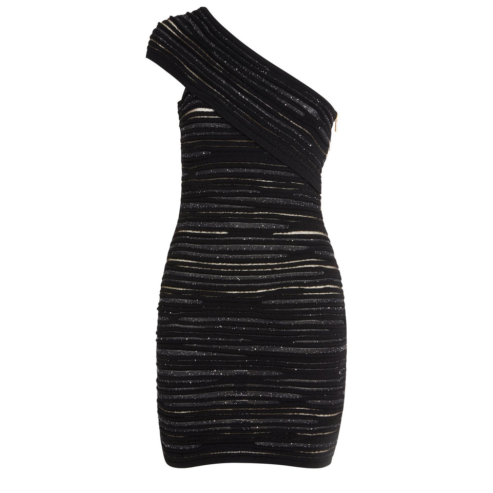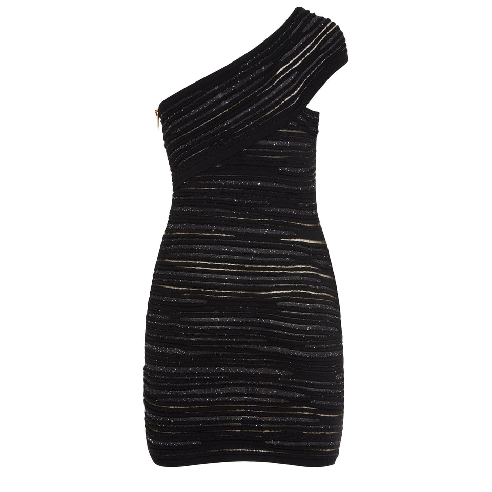 One-shoulder dress in fabric with all-over glitter and side zip closure.