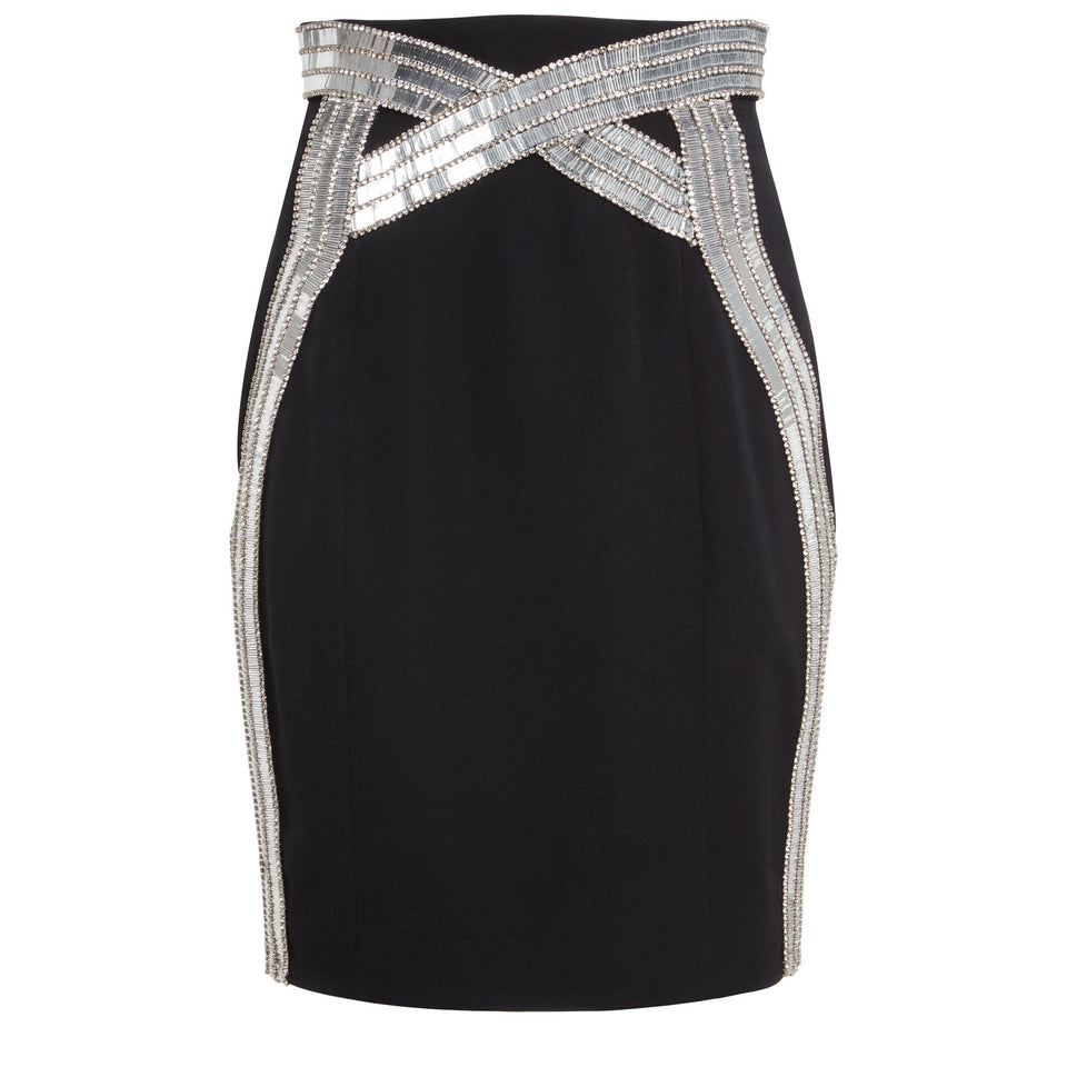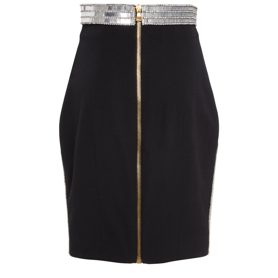 High-waisted wool skirt with contrasting sequins and back zip closure.