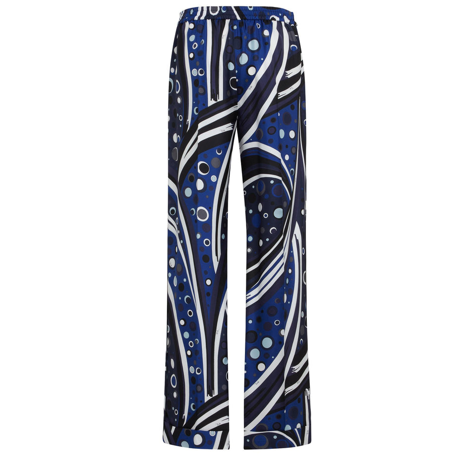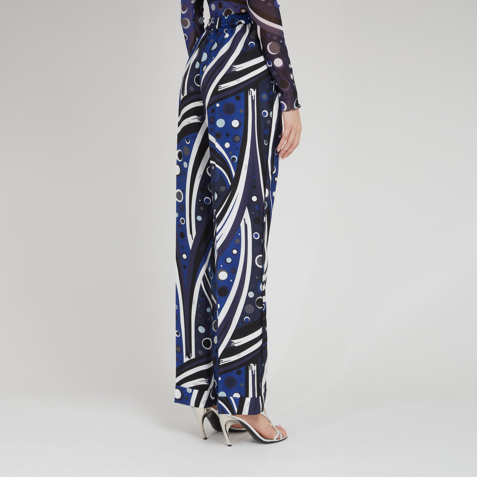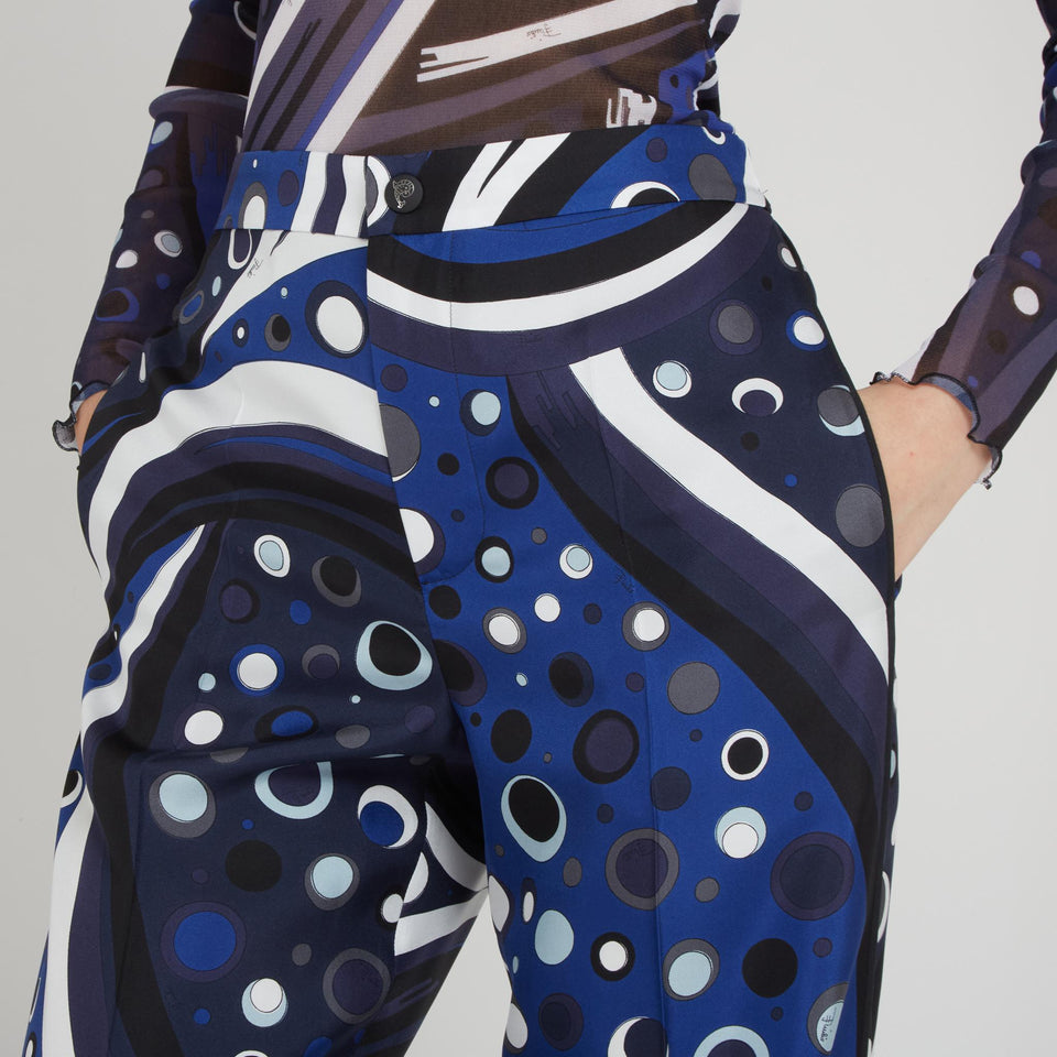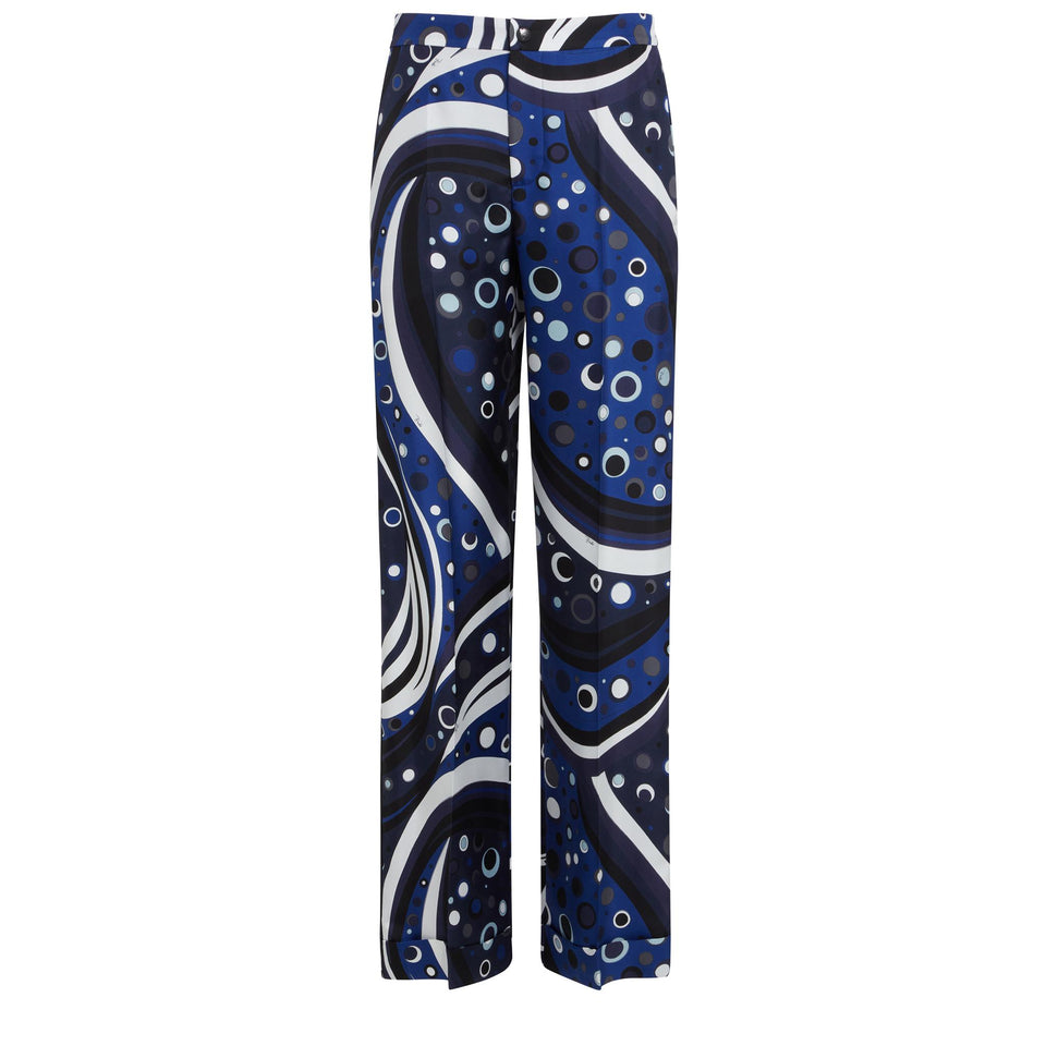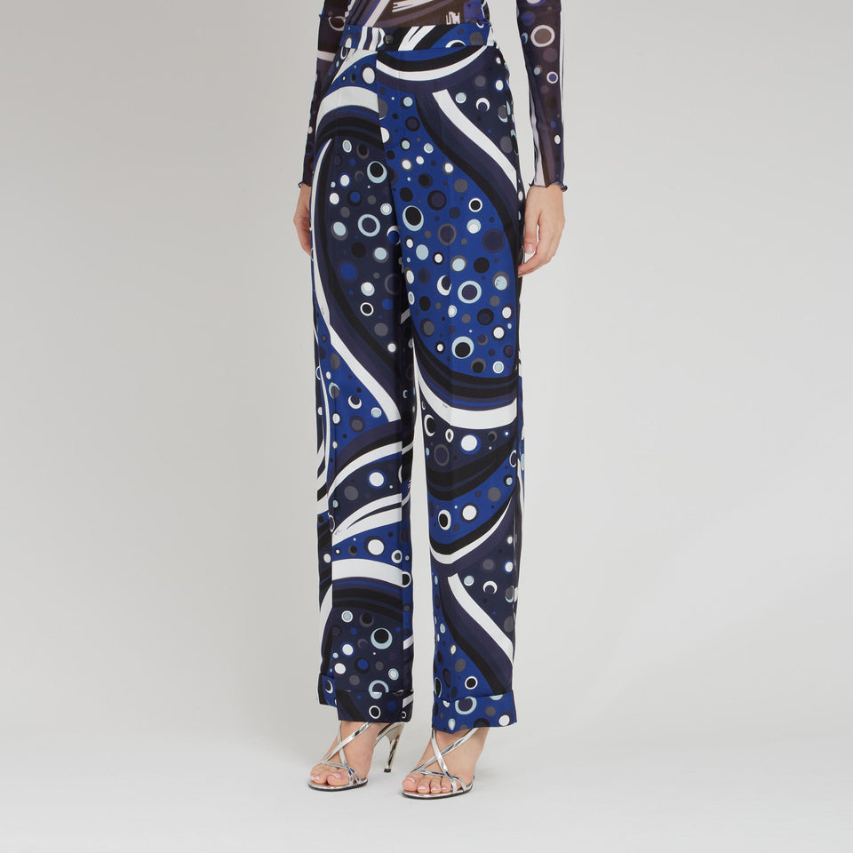 Wide-leg silk trousers, fountain print detail and front zip and button fastening.