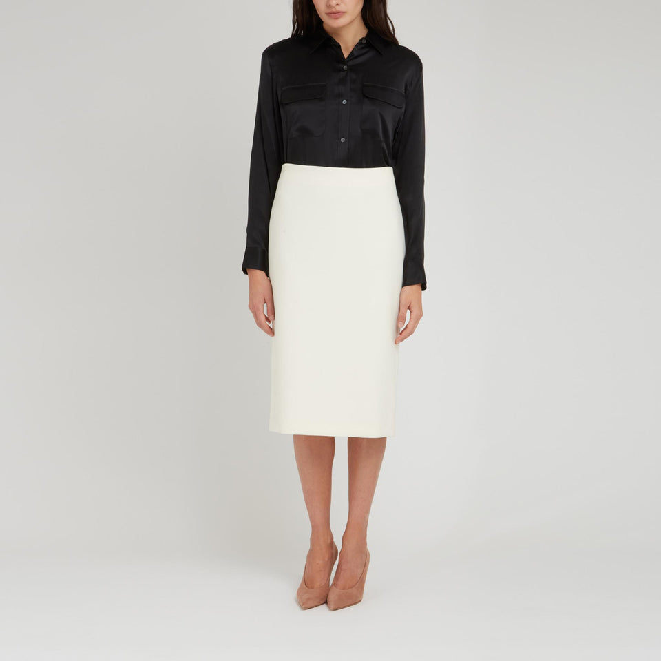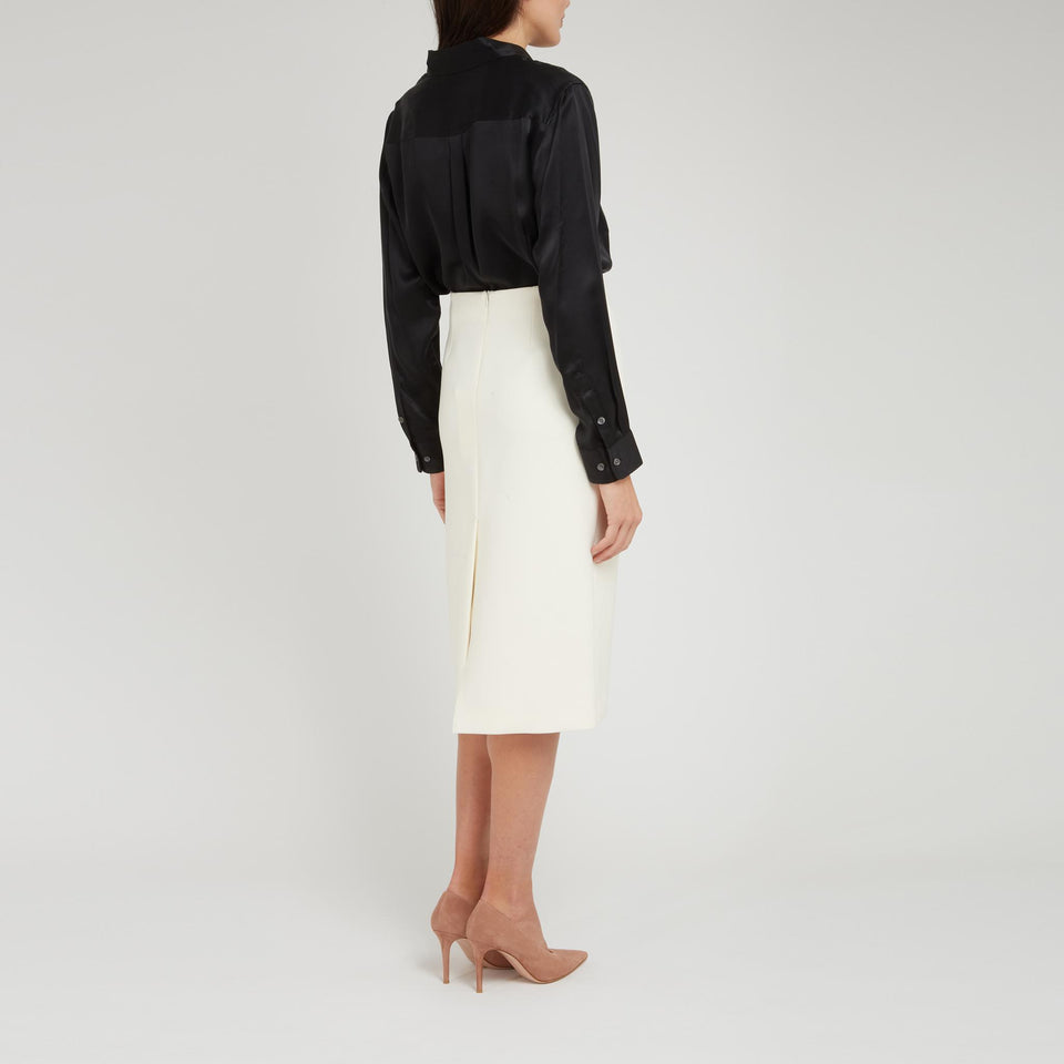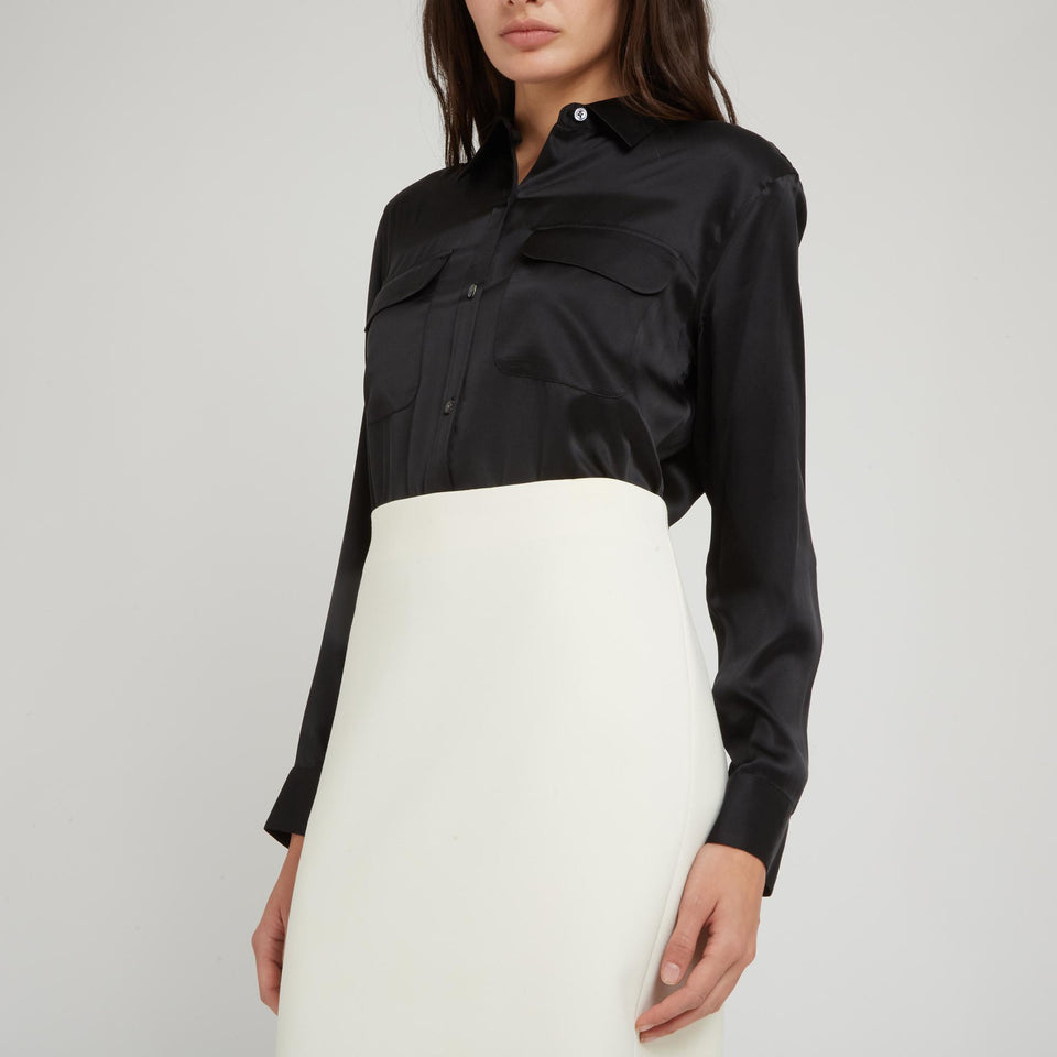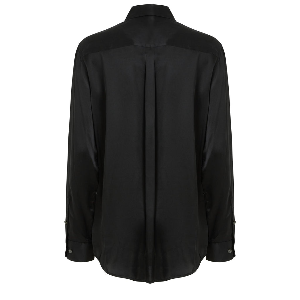 Silk shirt with long sleeves and collar, two front flap pockets and seven-button front closure.