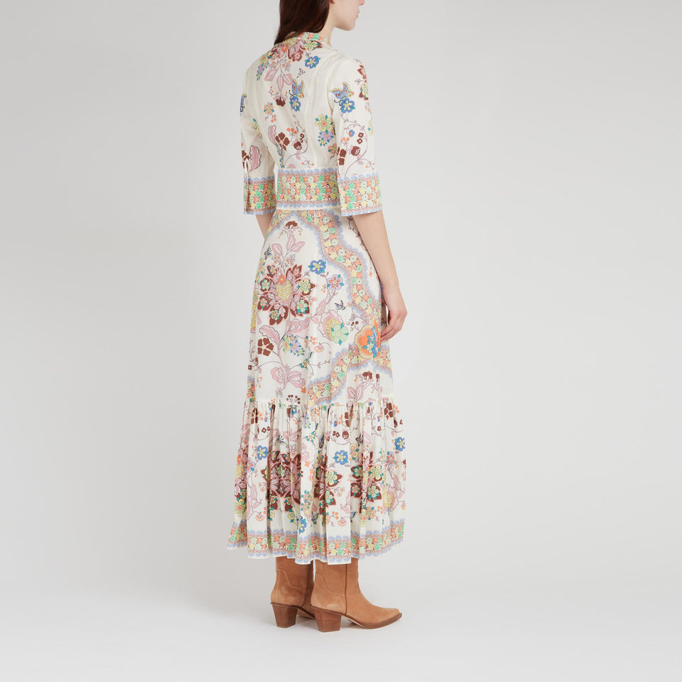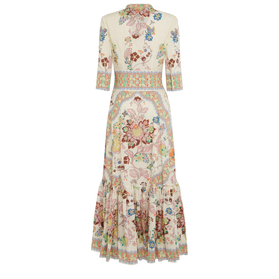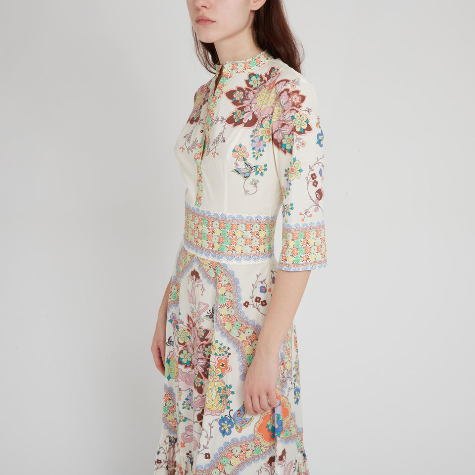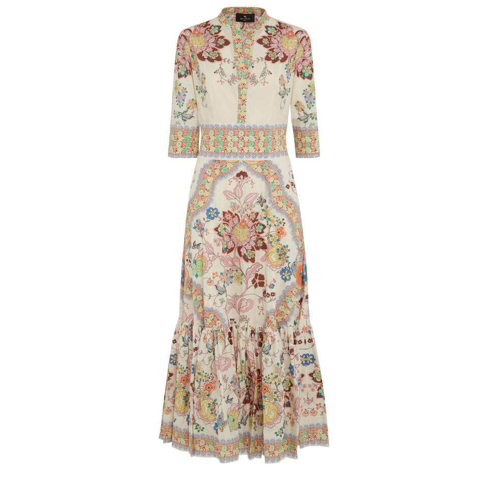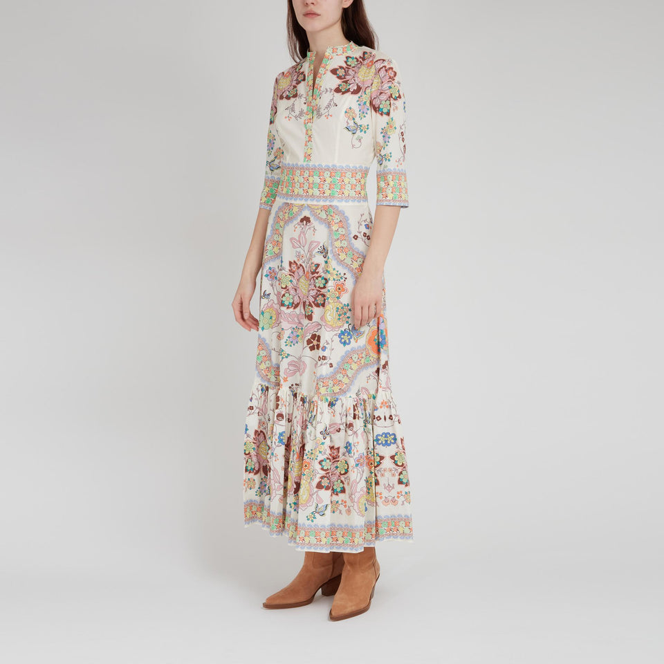 Long cotton dress with three-quarter sleeves and Korean collar, elasticated waist, all-over multi-coloured pattern and front button fastening.