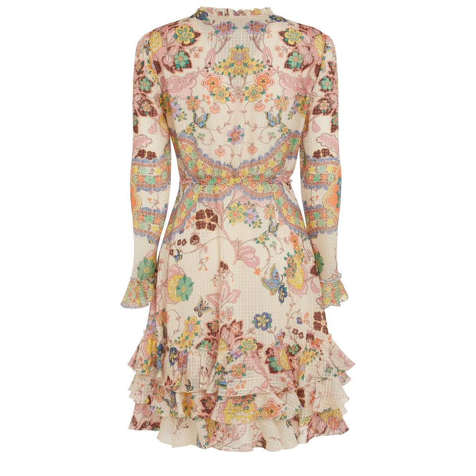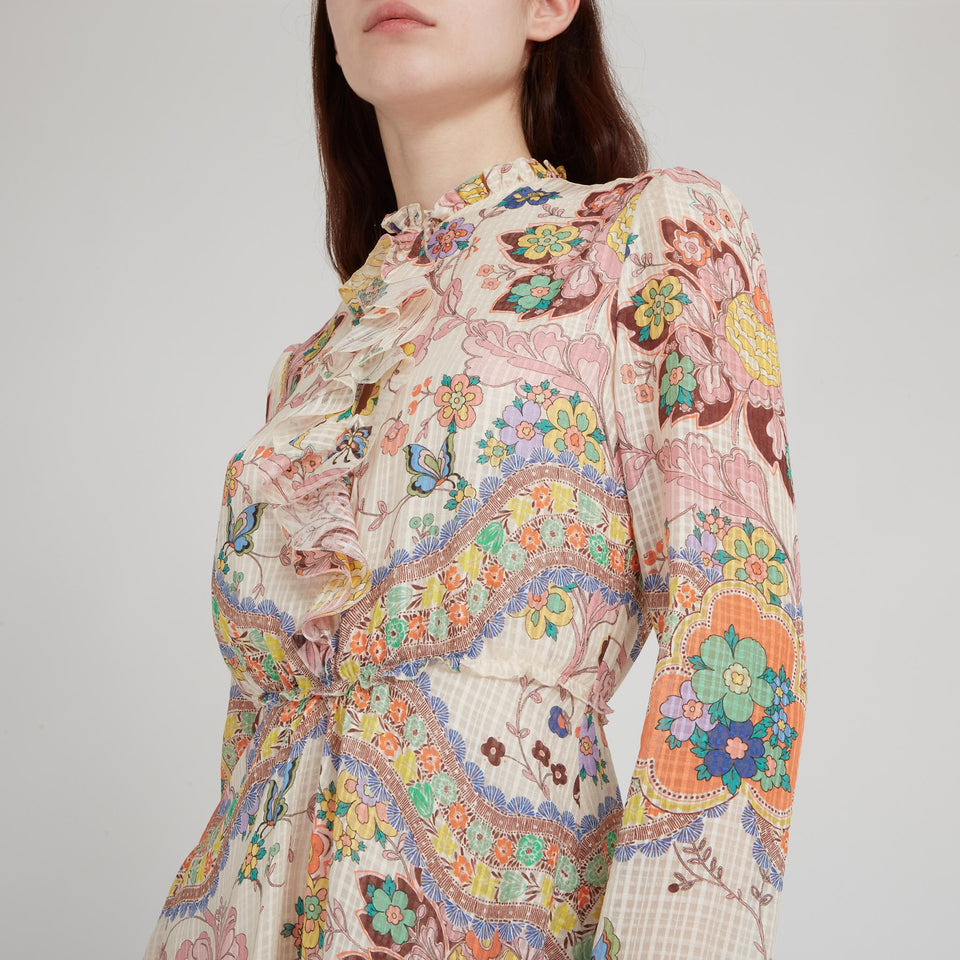 Silk midi dress with long sleeves and crew neck, multi-coloured all-over pattern and front button fastening.