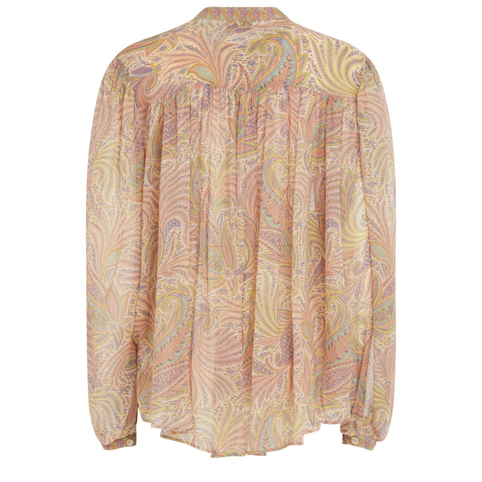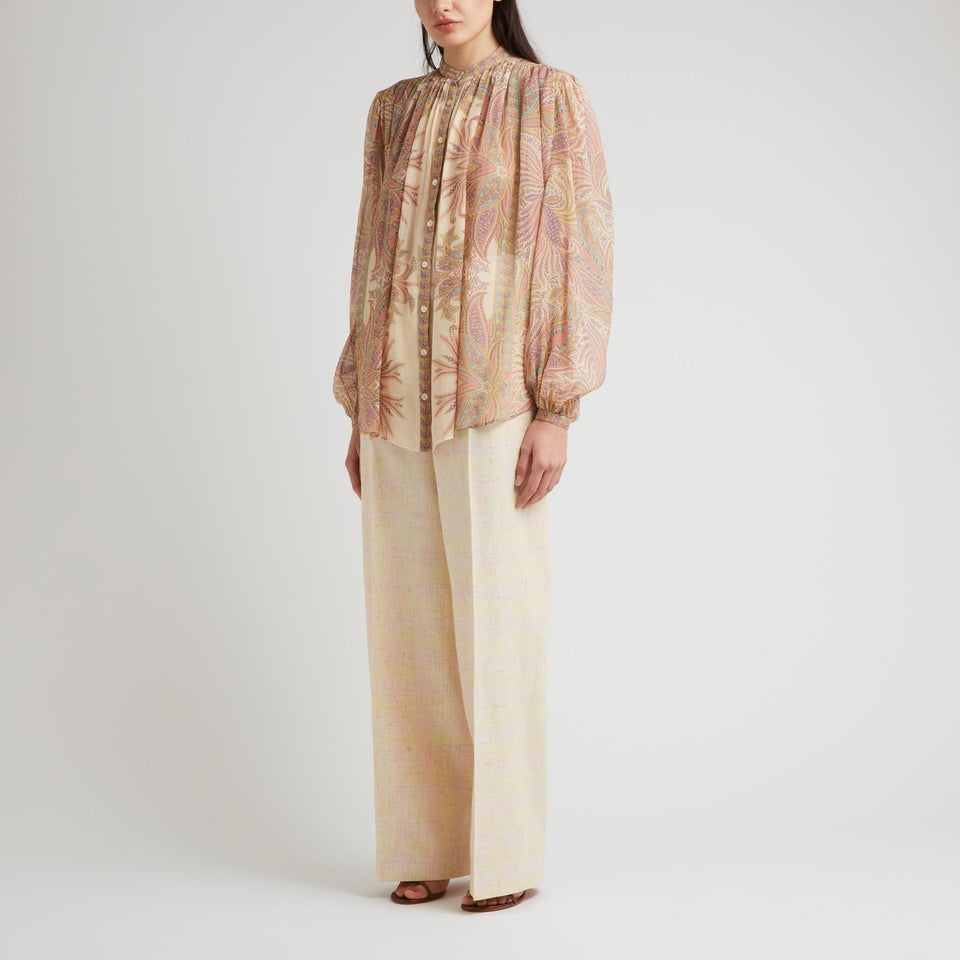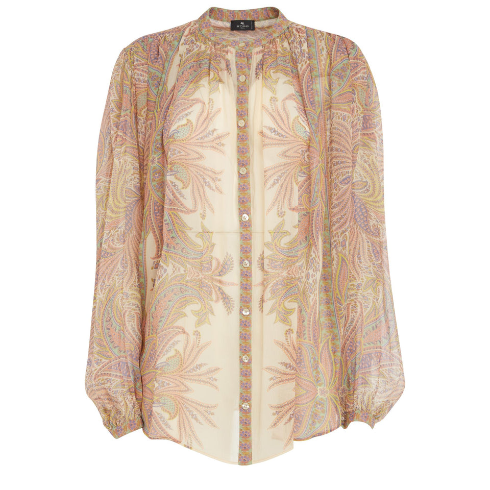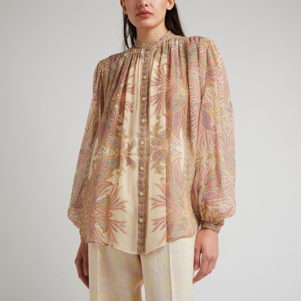 Silk shirt with long sleeves and Korean collar, multi-coloured all-over pattern and nine-button front closure.