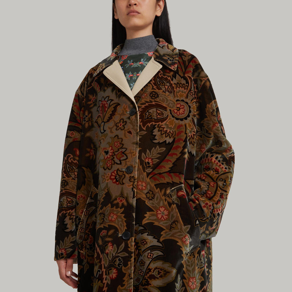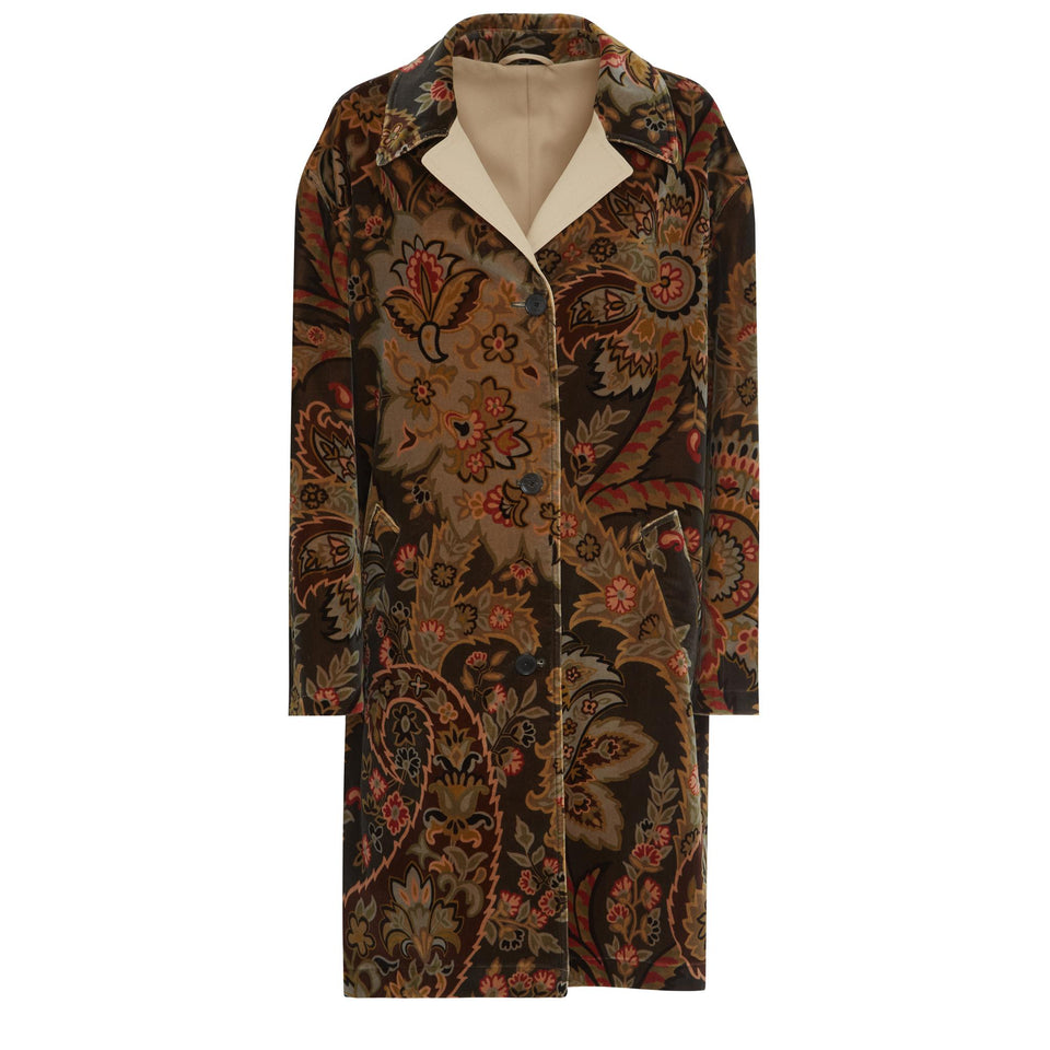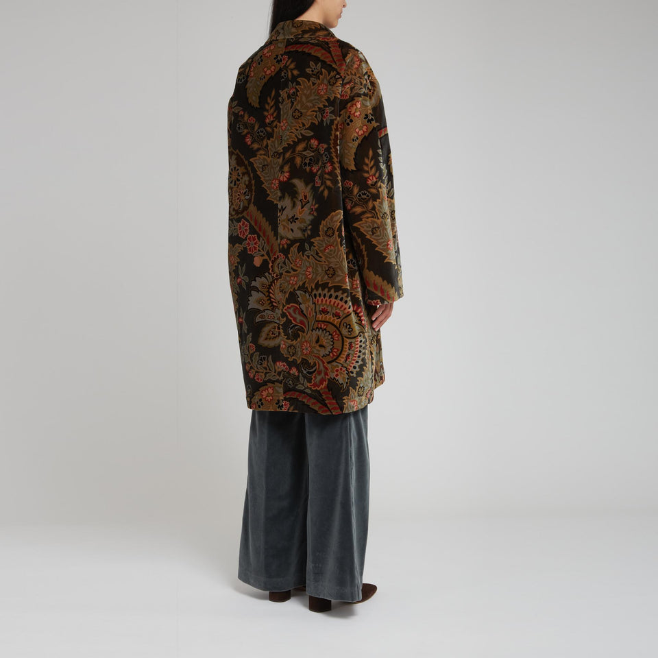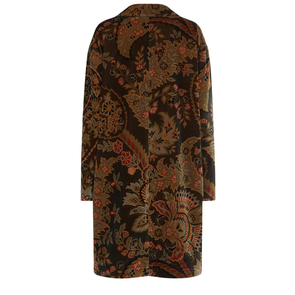 Fabric coat with long sleeves and lapels, multicolor all-over pasley pattern and hidden front closure.