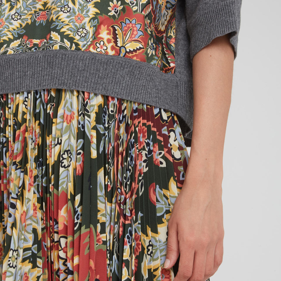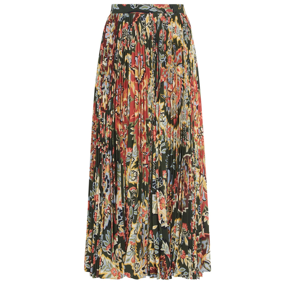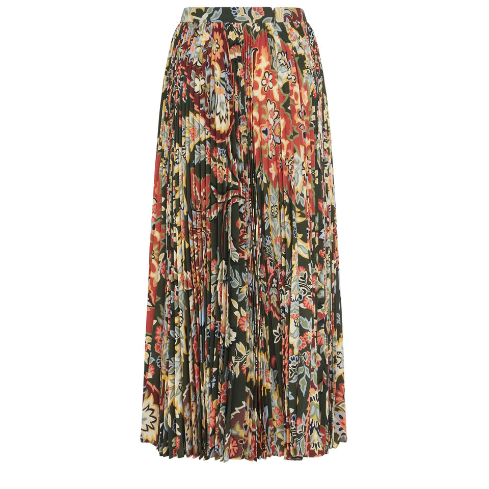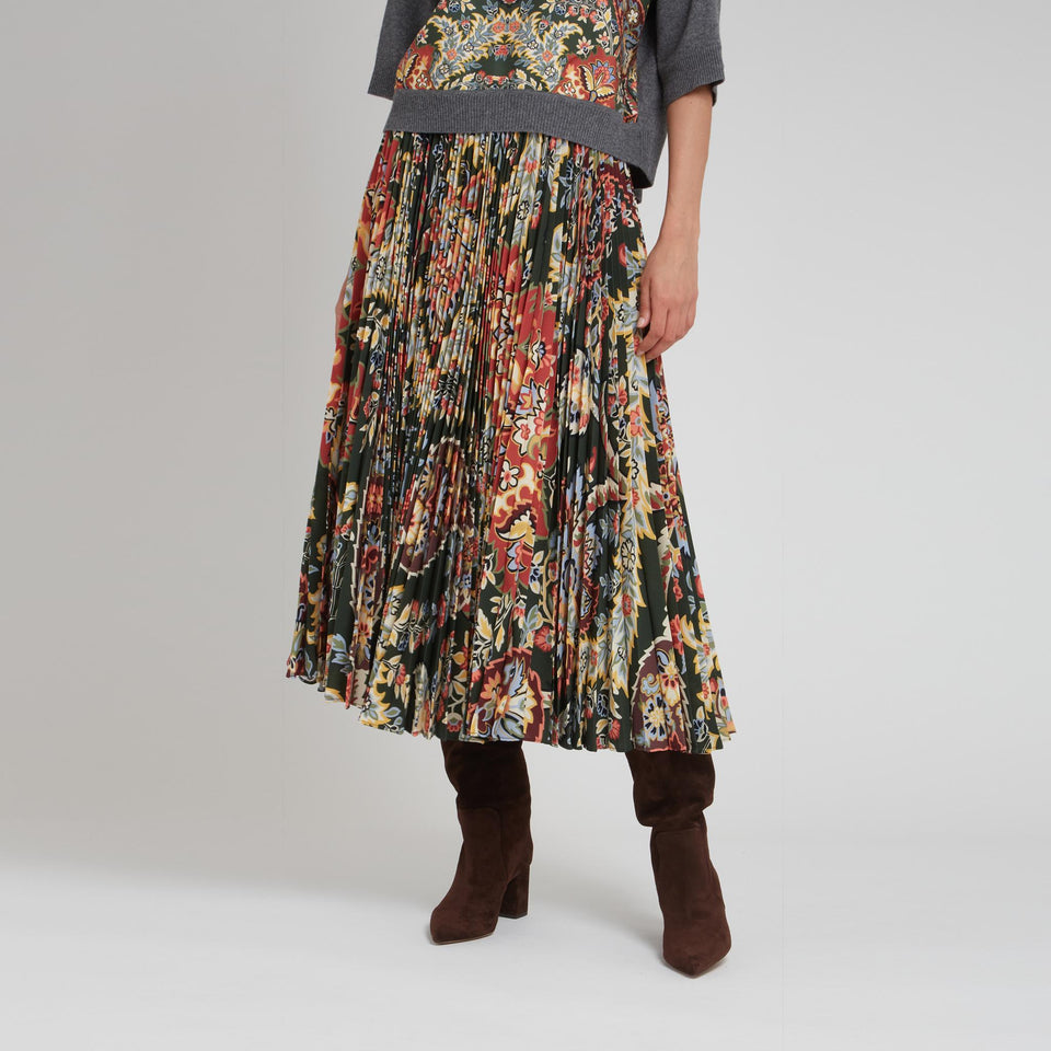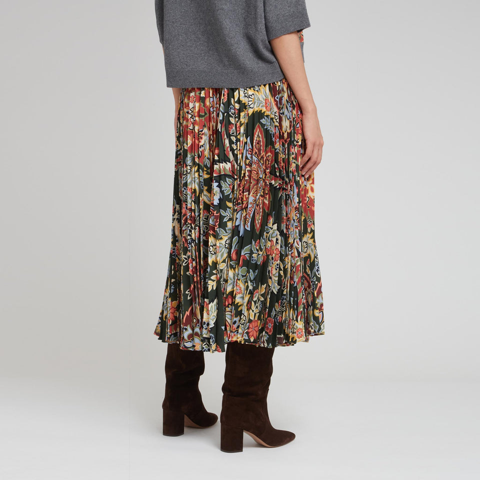 Long skirt in fabric with all-over multicolor floral pattern and back zip closure.