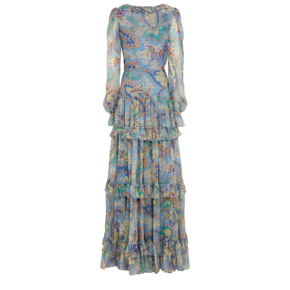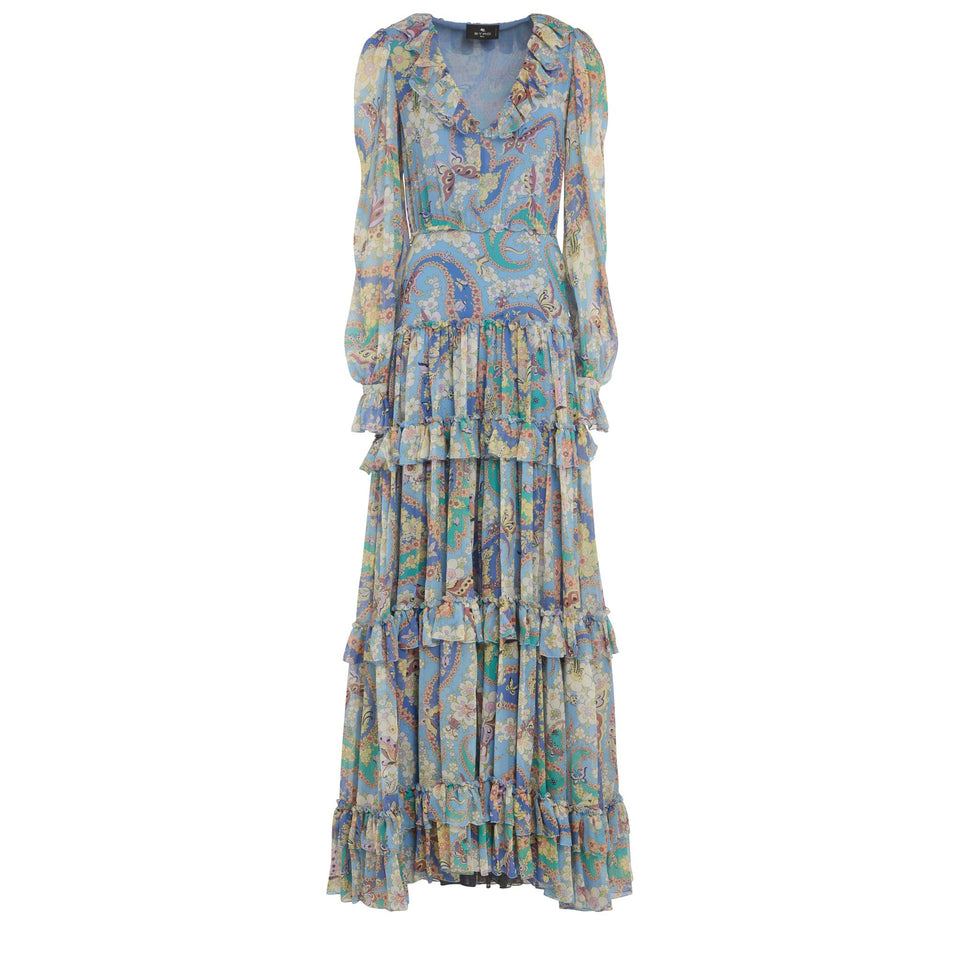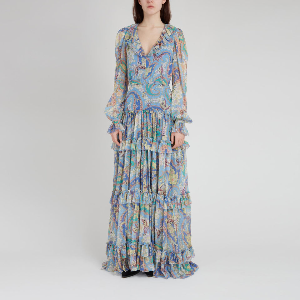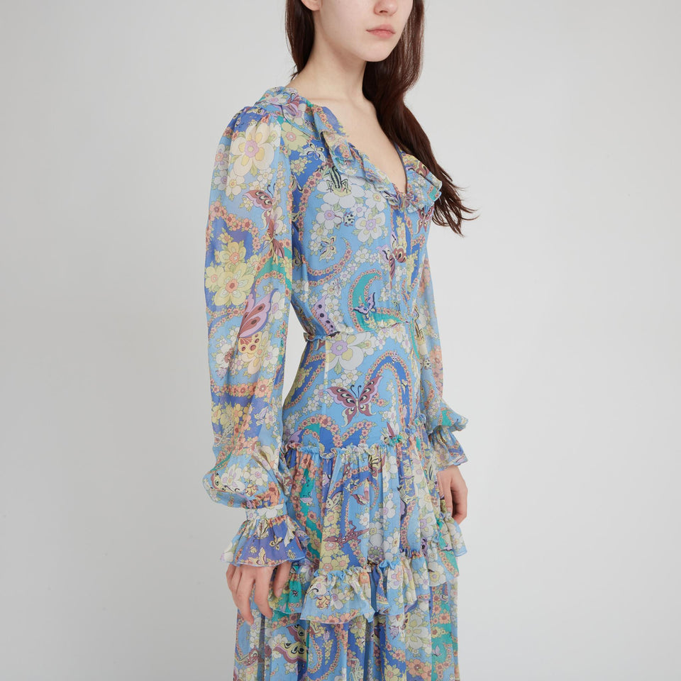 Maxi silk dress with long sleeves and V-neck, multi-coloured all-over pattern and back zip fastening.