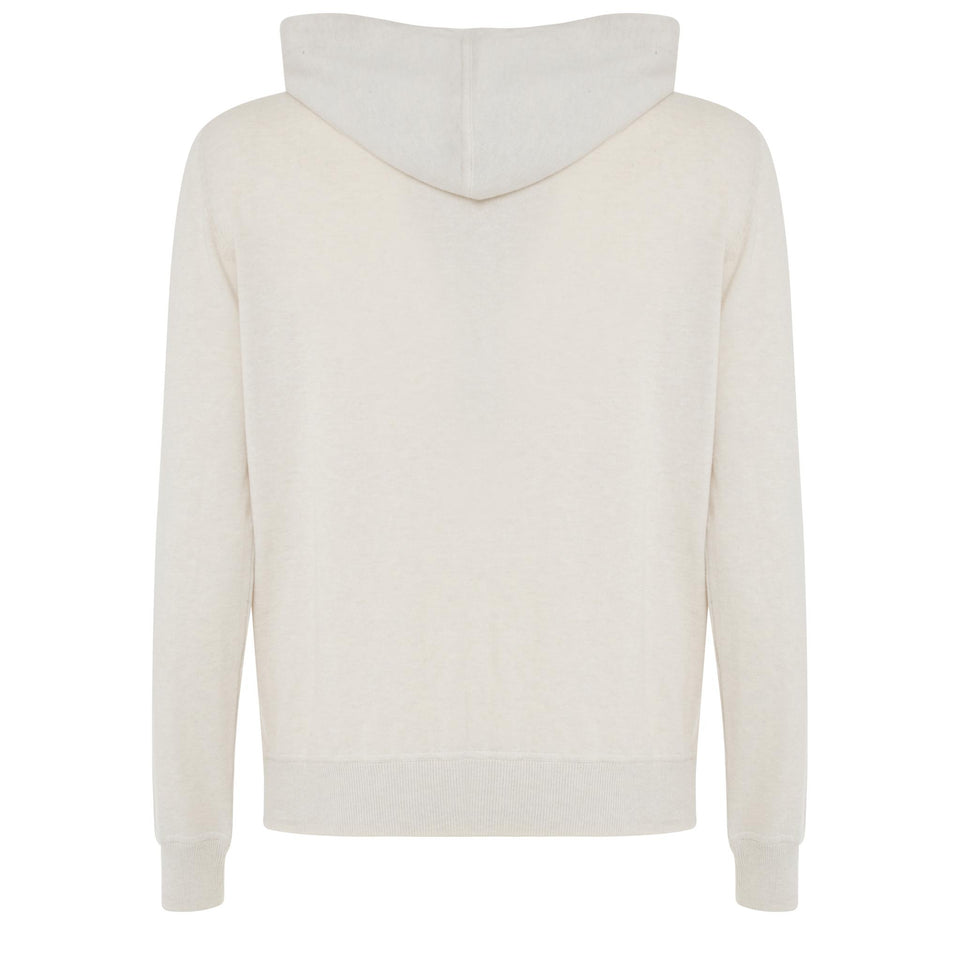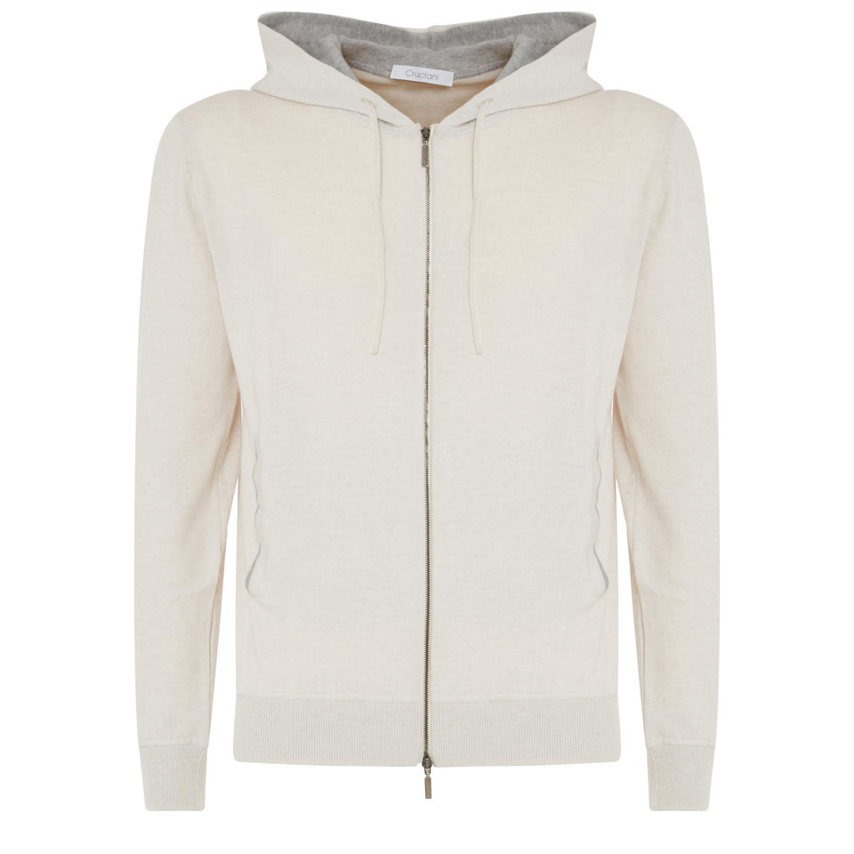 Cotton sweatshirt with long sleeves and hood, two side welt pockets and front zip fastening.