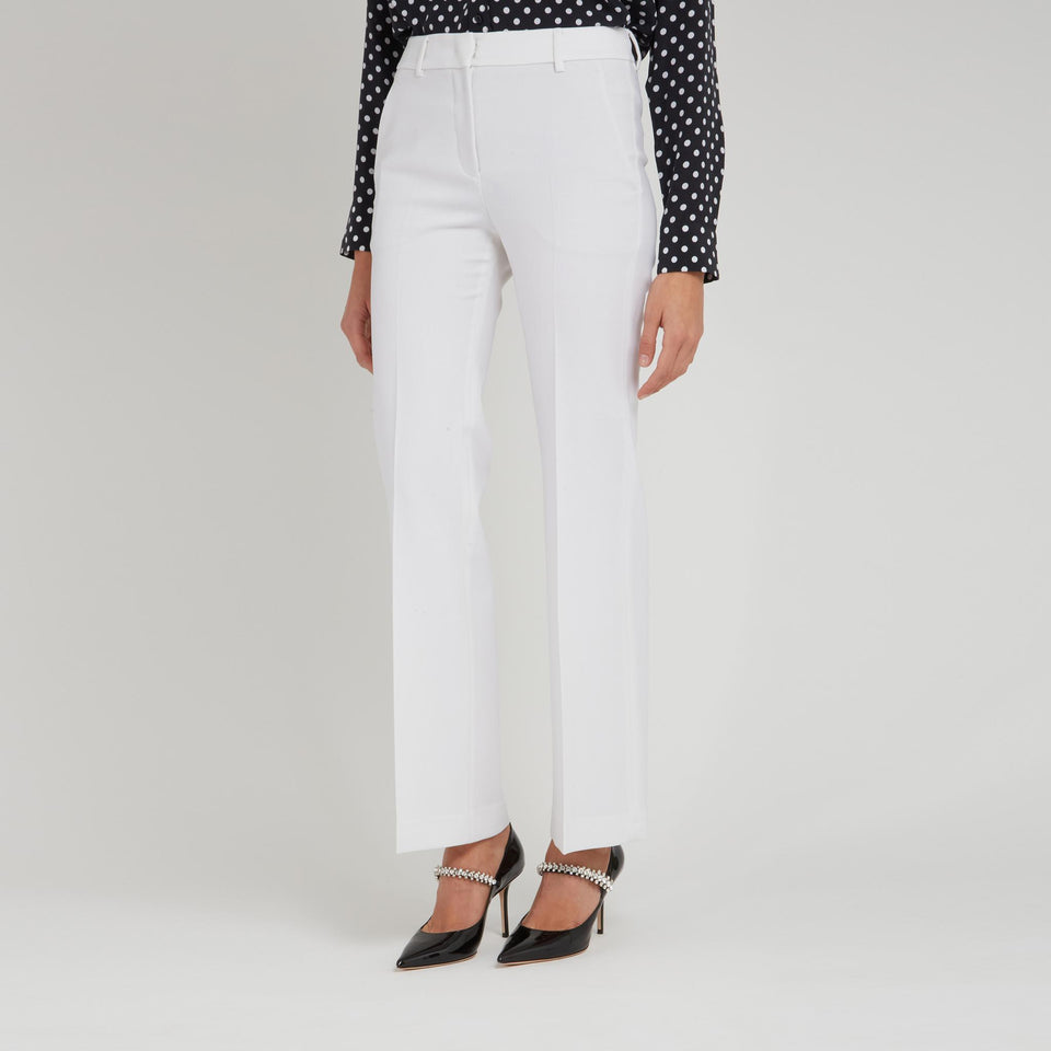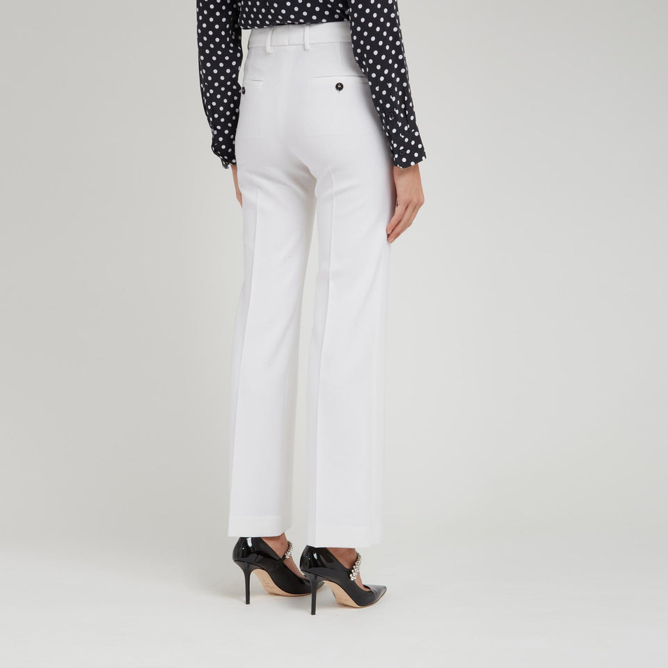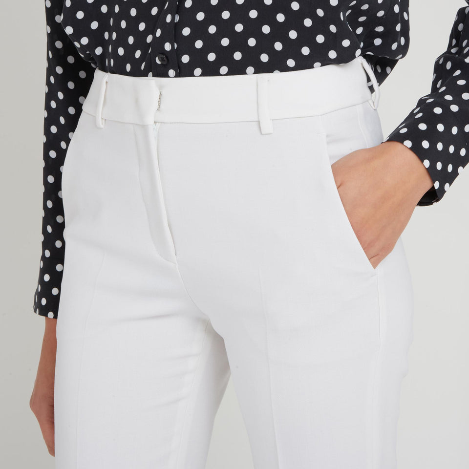 Tailored wool trousers with belt loops, two side pockets and two rear welt pockets and concealed front closure.