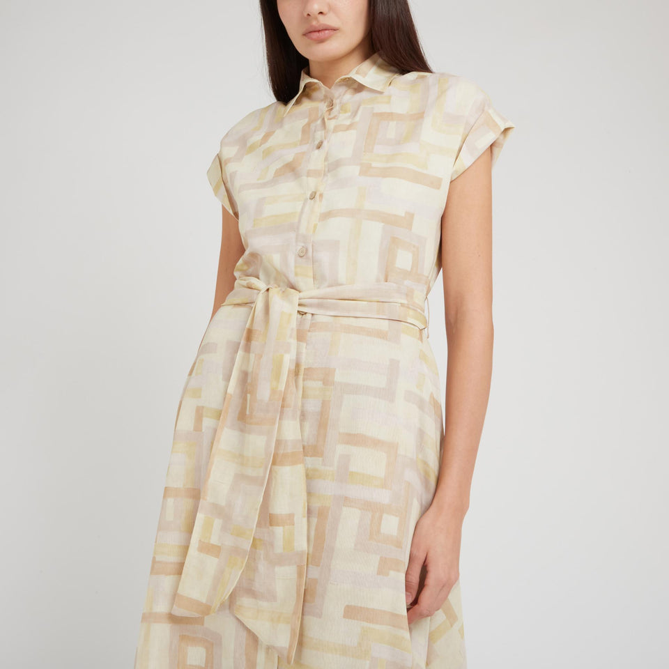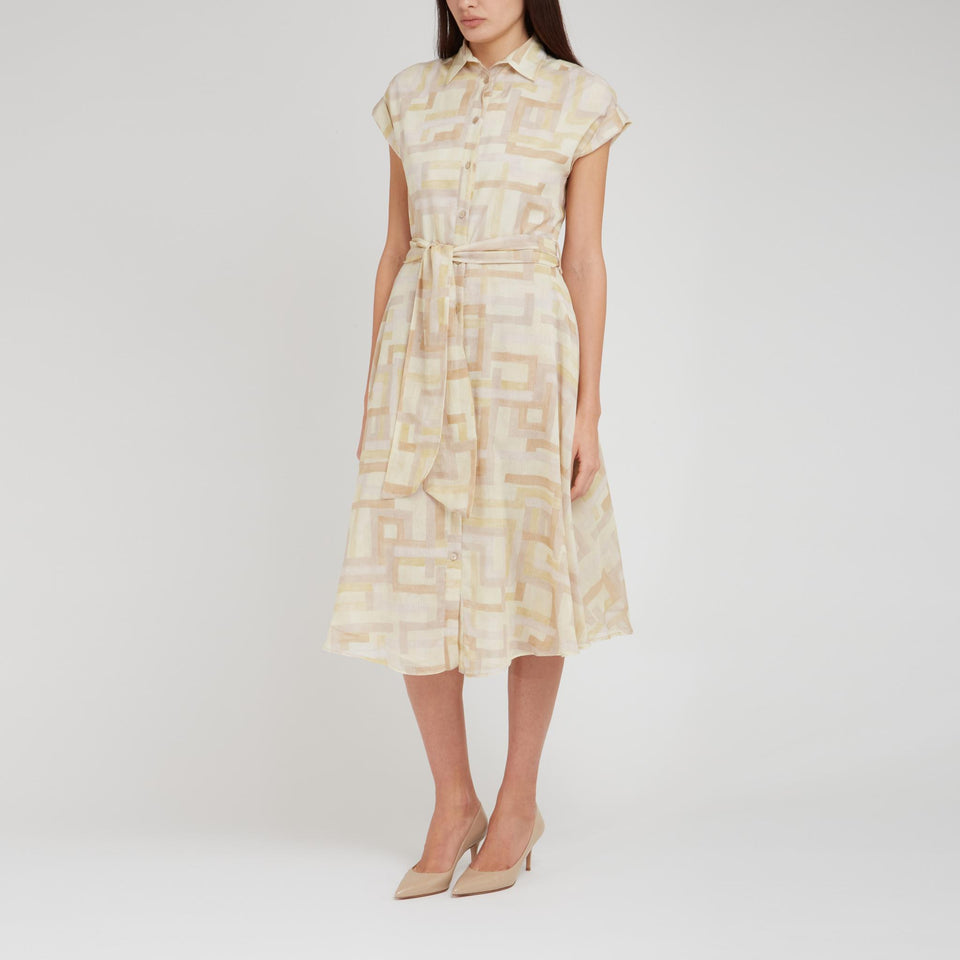 Cotton and silk dress with short sleeves and collar, all-over abstract print and front knot fastening.