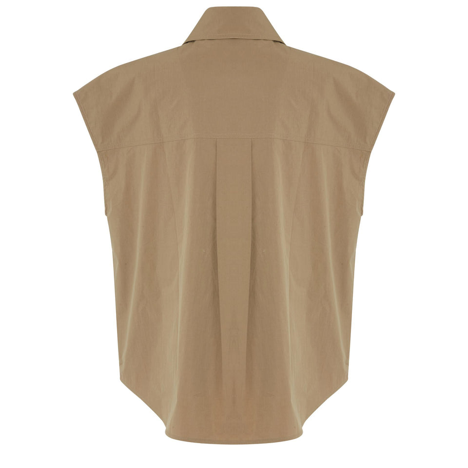 Sleeveless fabric shirt with classic collar, two front pockets with flap and five -button closure.