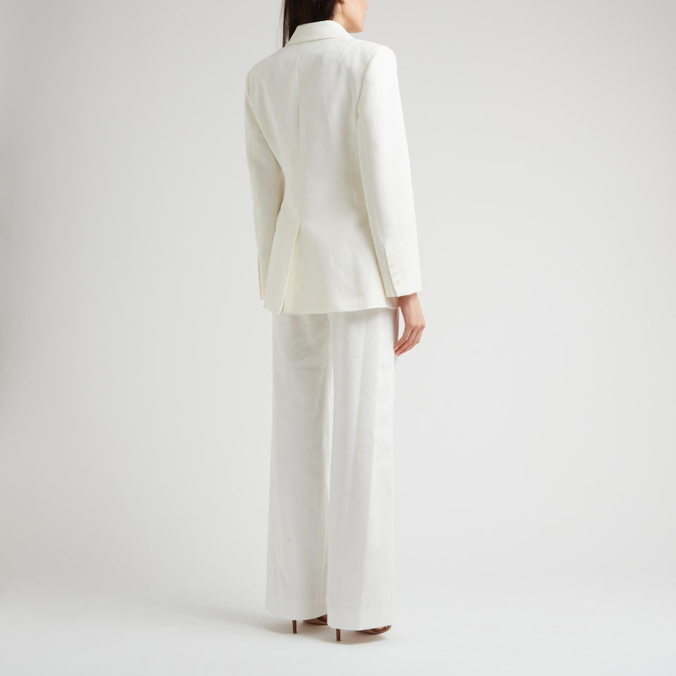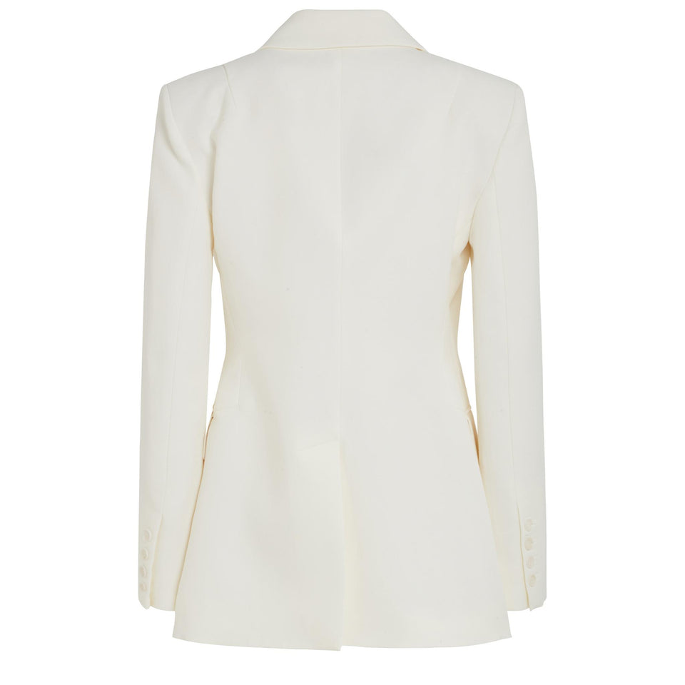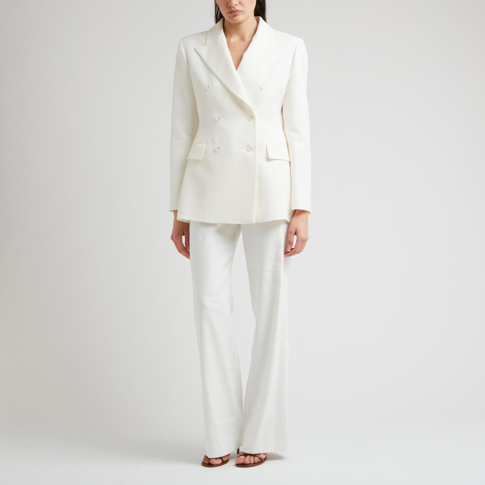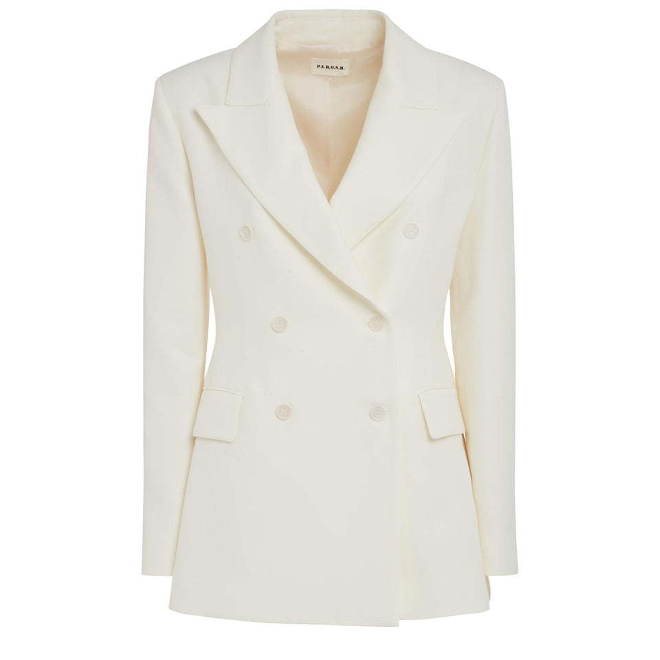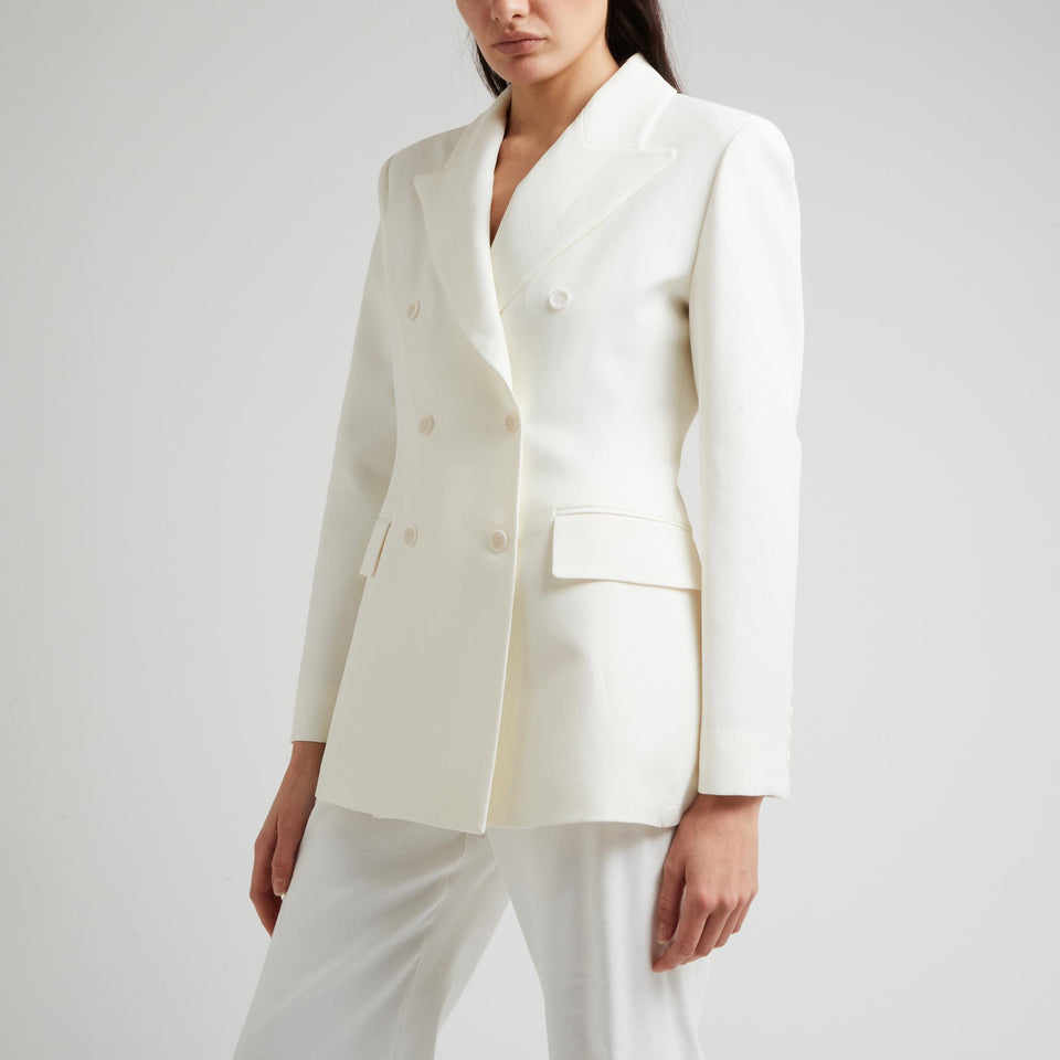 Double-breasted fabric jacket with long sleeves and peak lapels, two side pockets with flap and six-button front fastening.