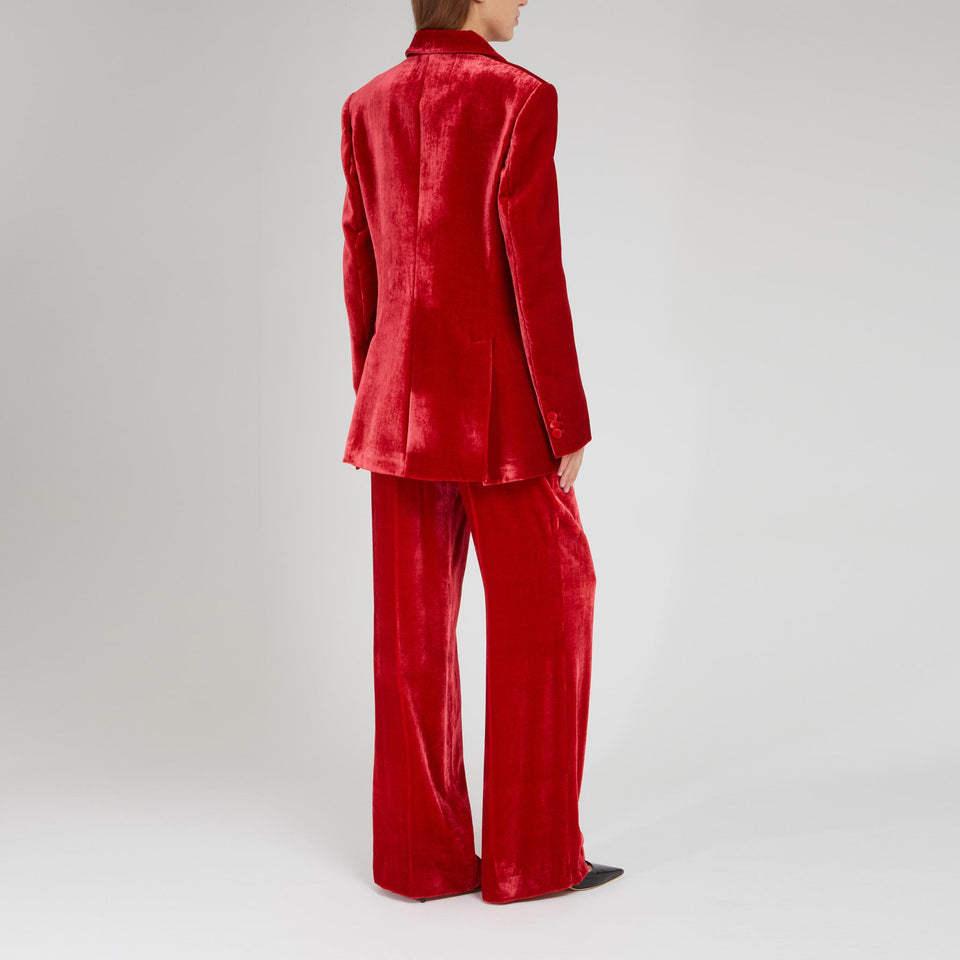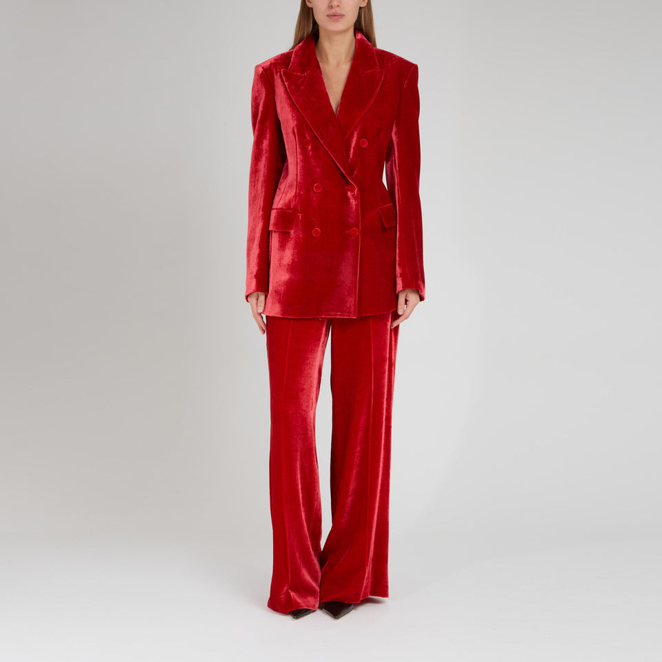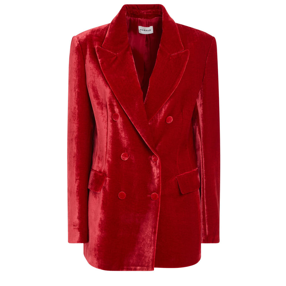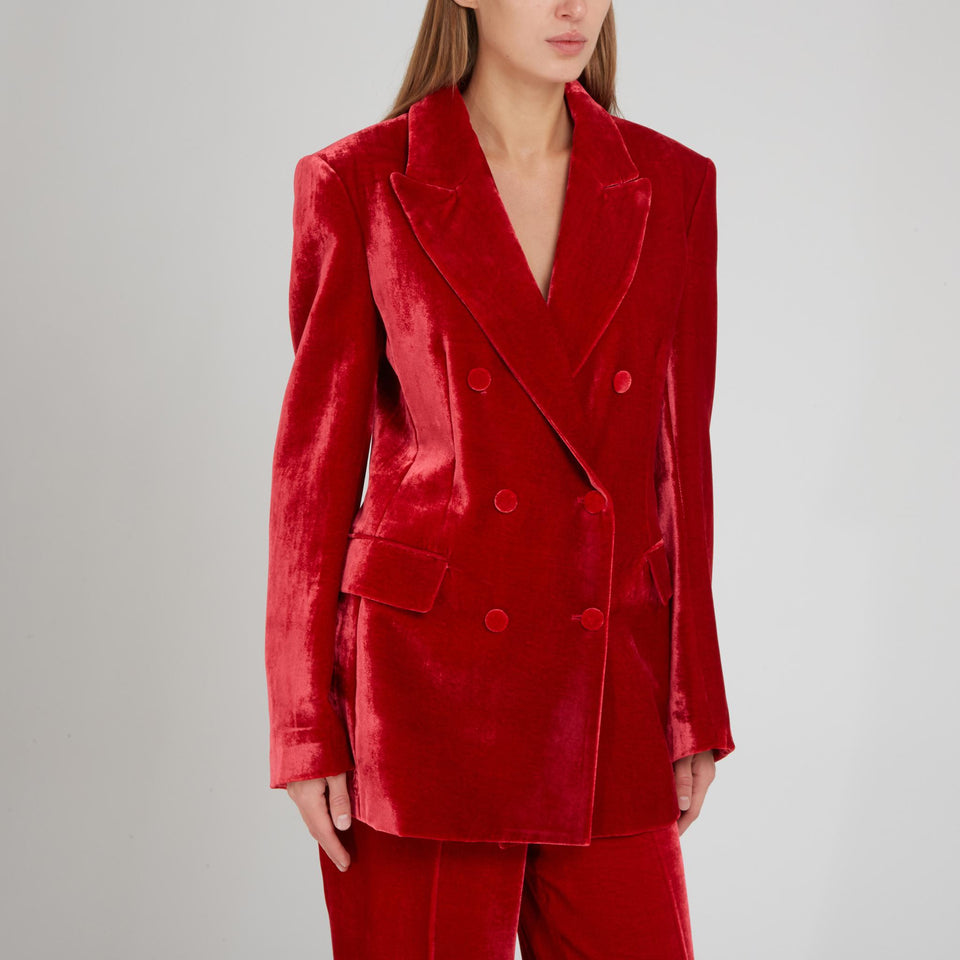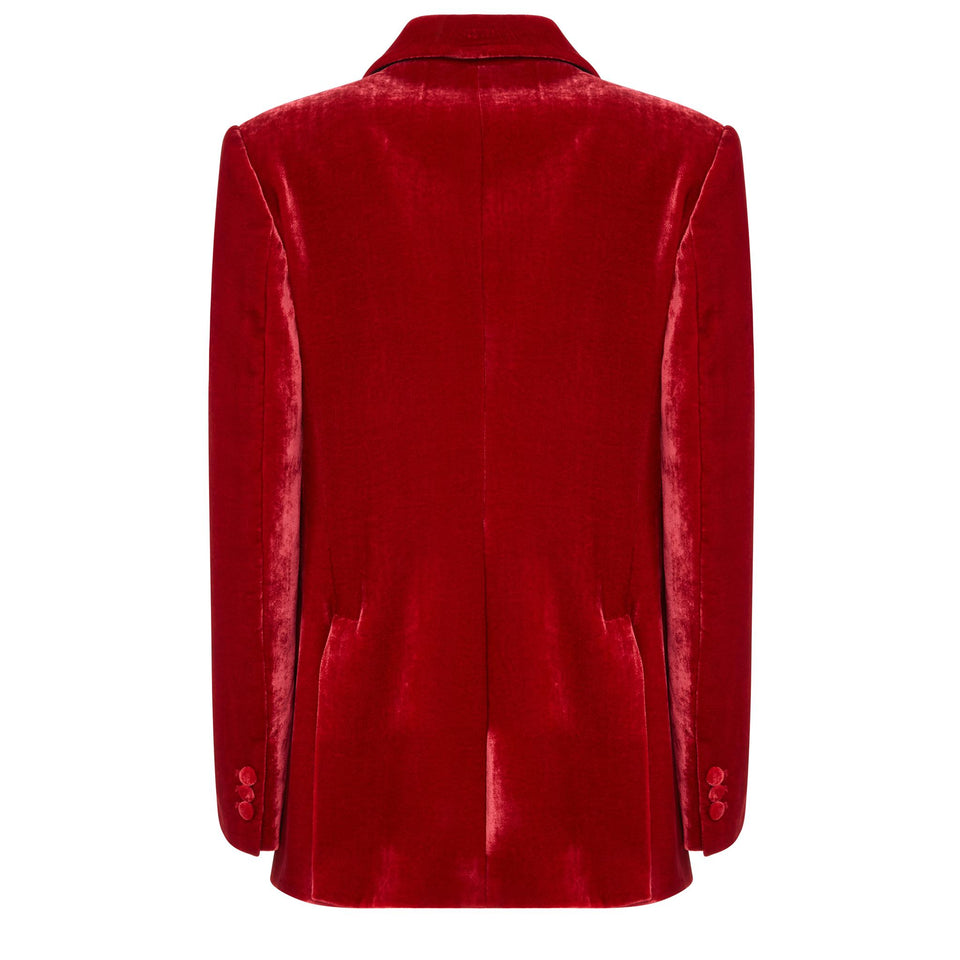 Double-breasted fabric jacket with long sleeves and peak lapels, two side pockets with flap and six-button front closure.