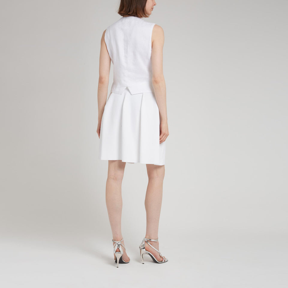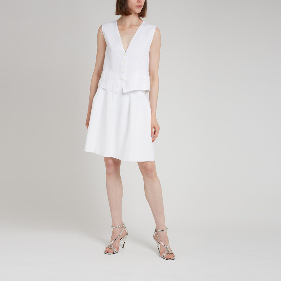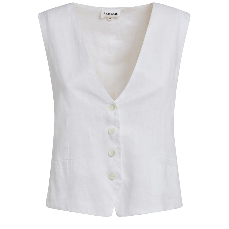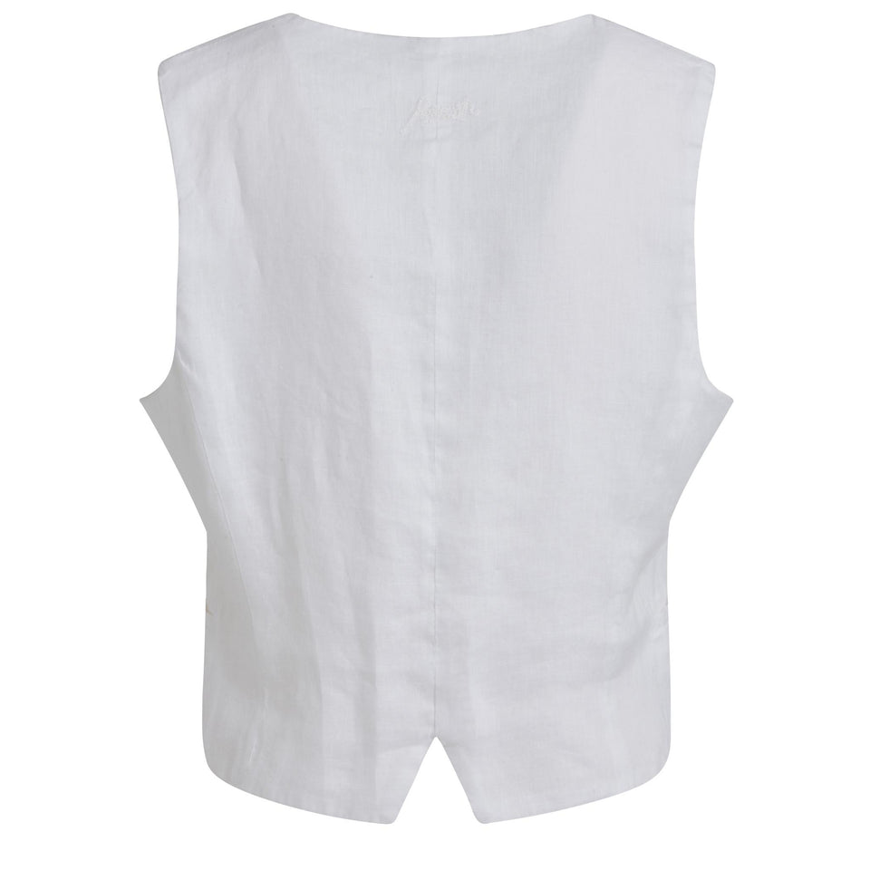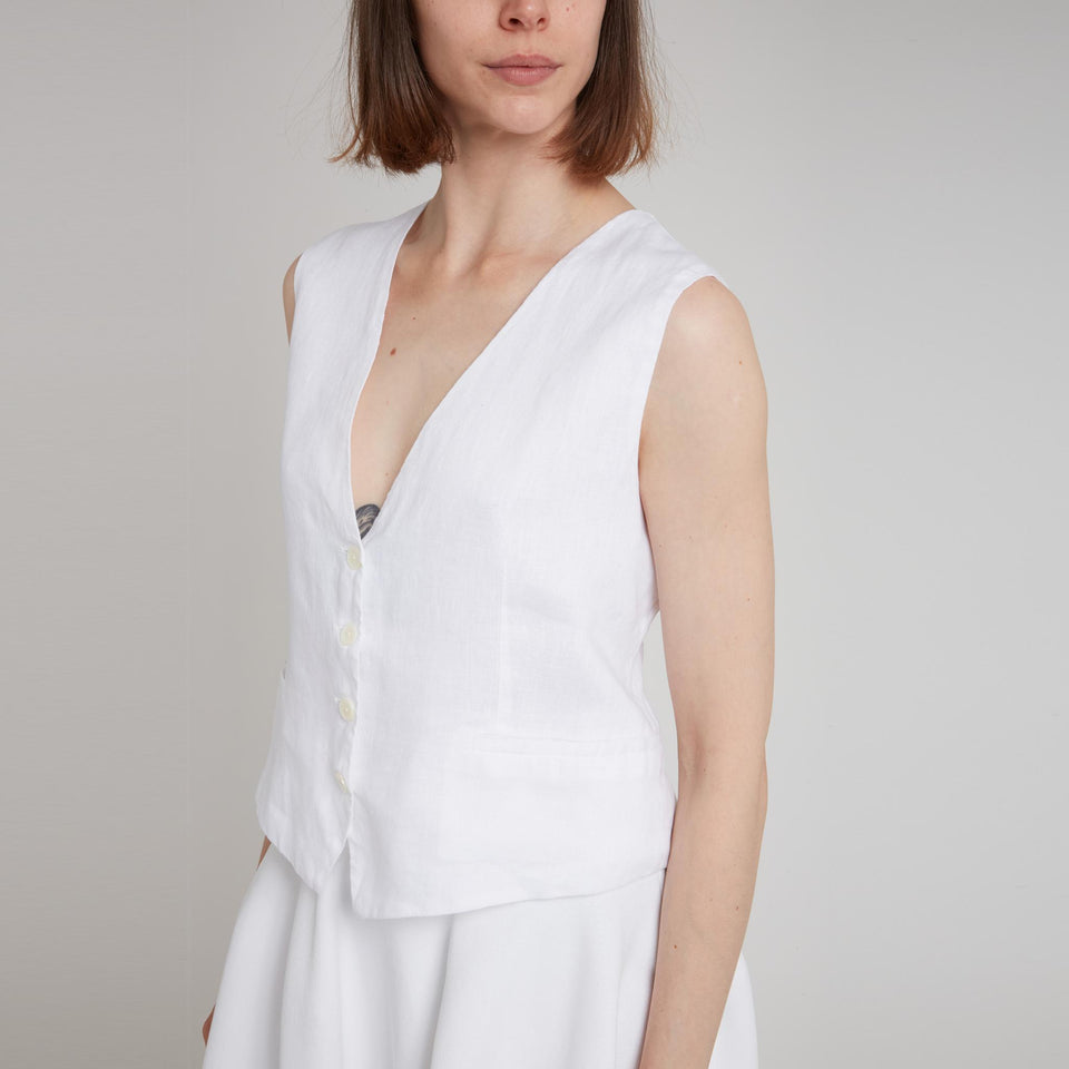 Linen vest with V-neck, two side welt pockets and four-button front closure.