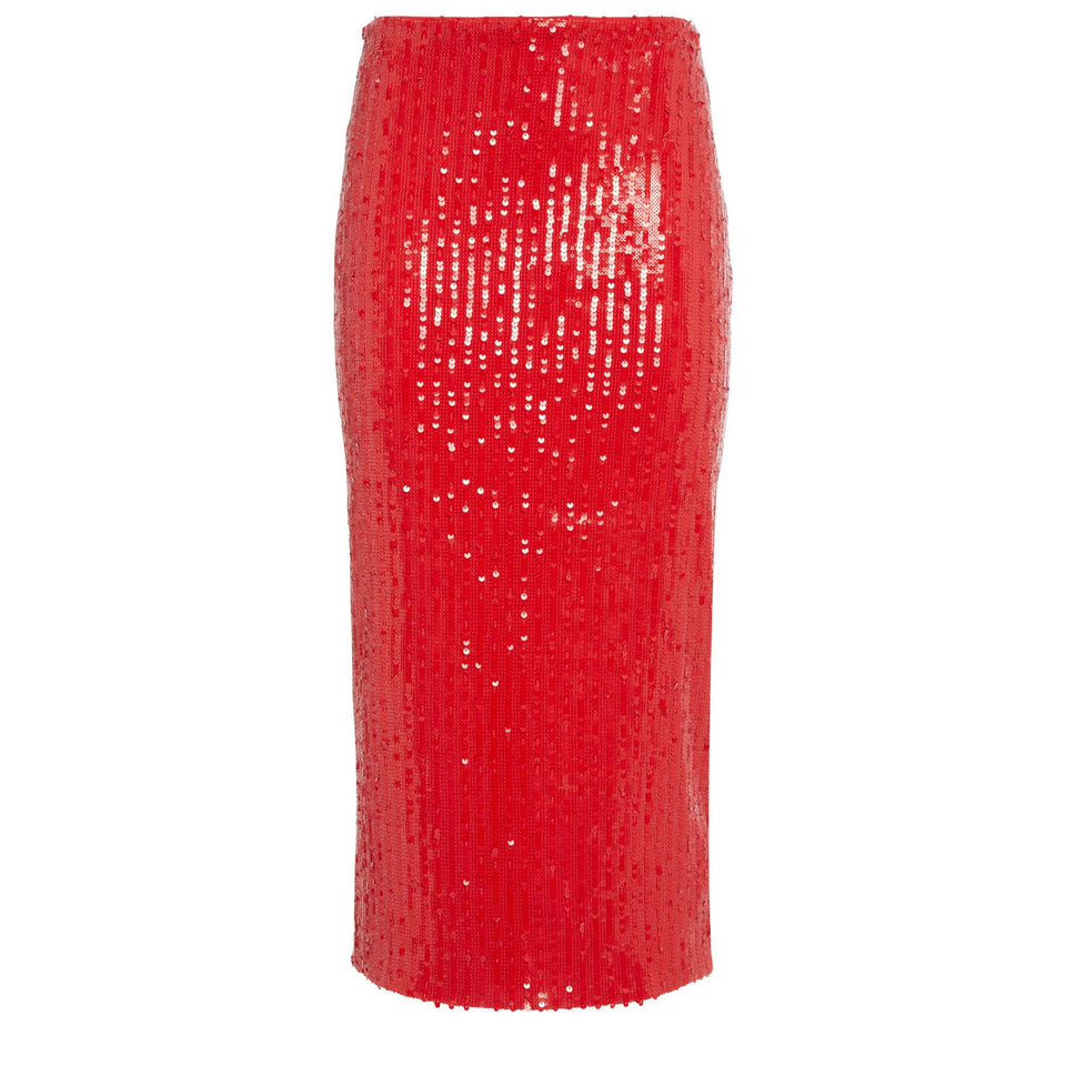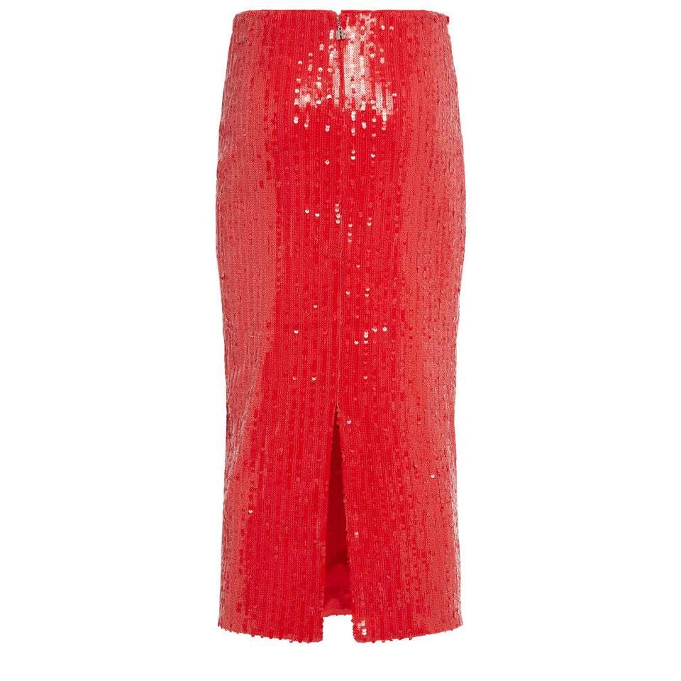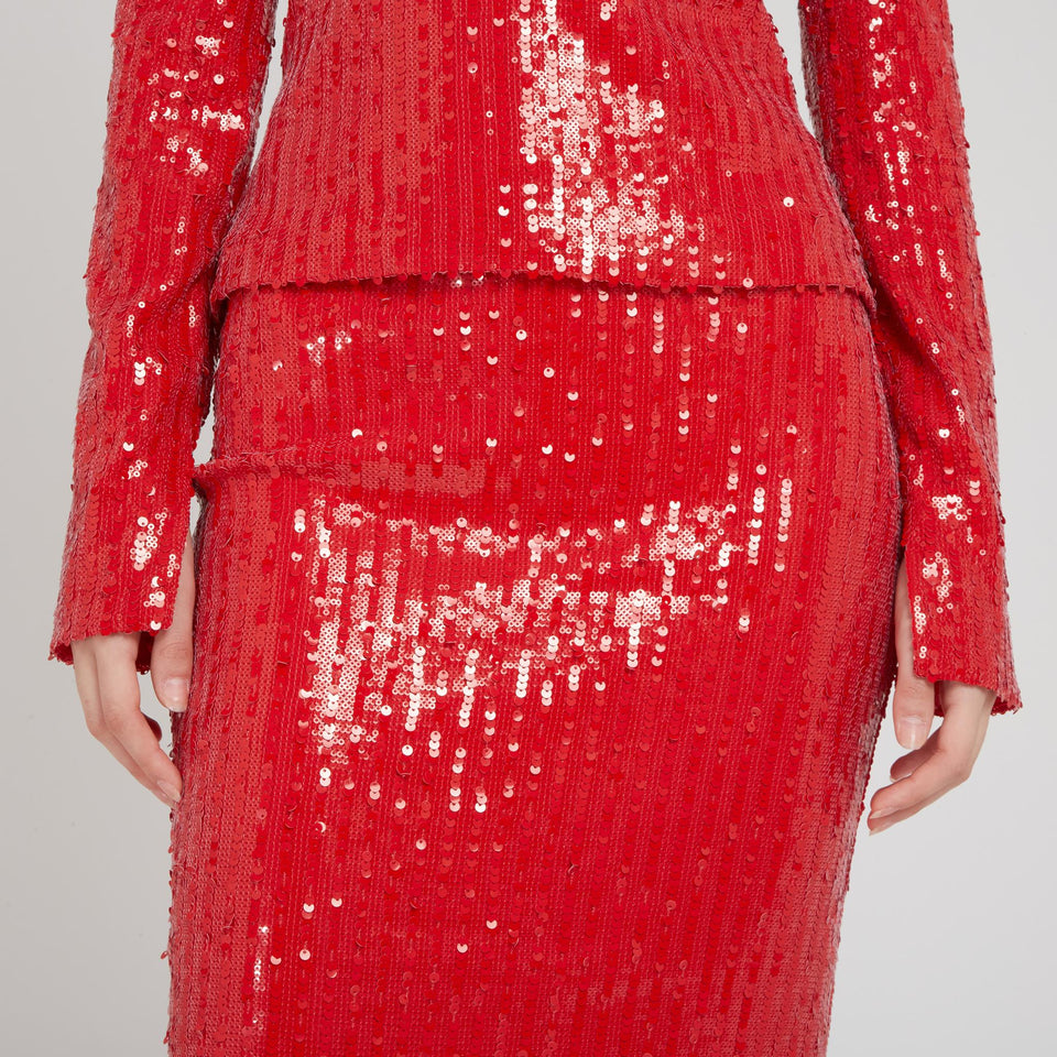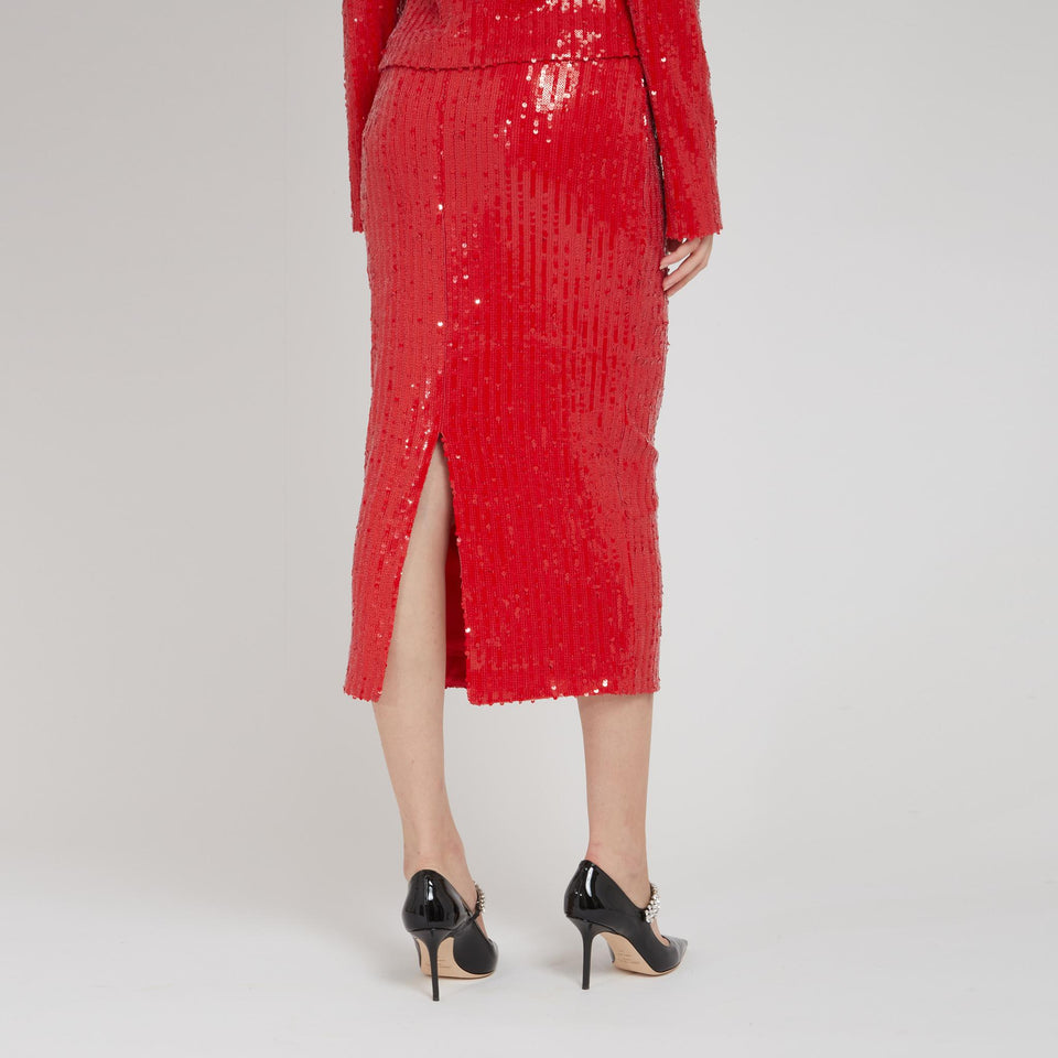 Long fabric skirt with back slit, all-over sequin detail and back zip closure.