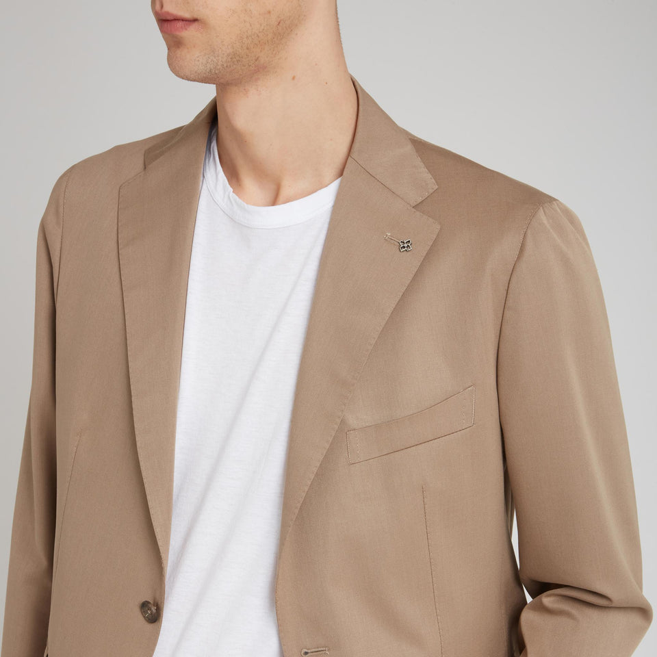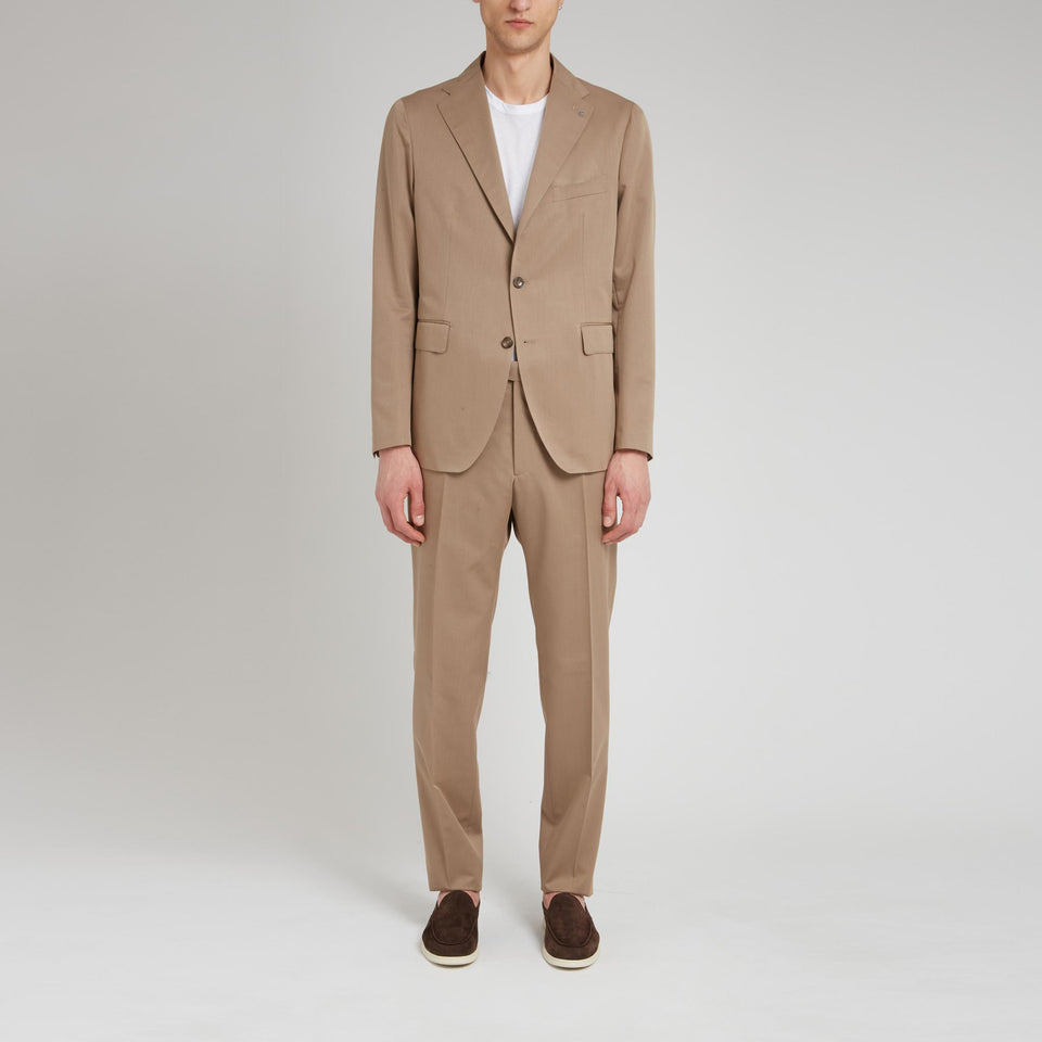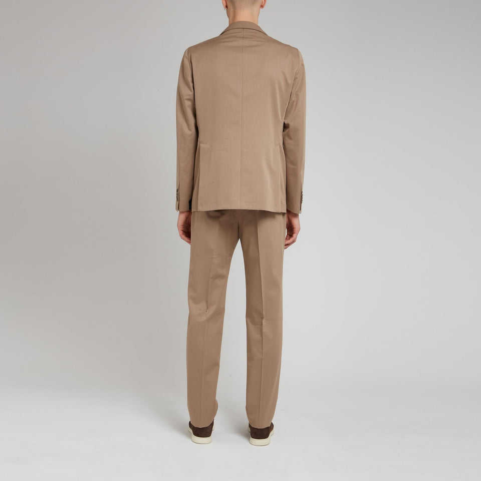 Single-breasted cotton suit with long sleeves and notched lapels, two side pockets with flap and two-button front closure.