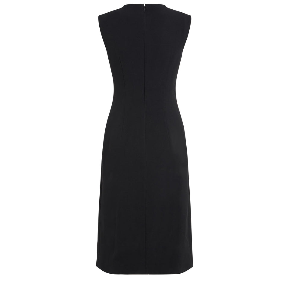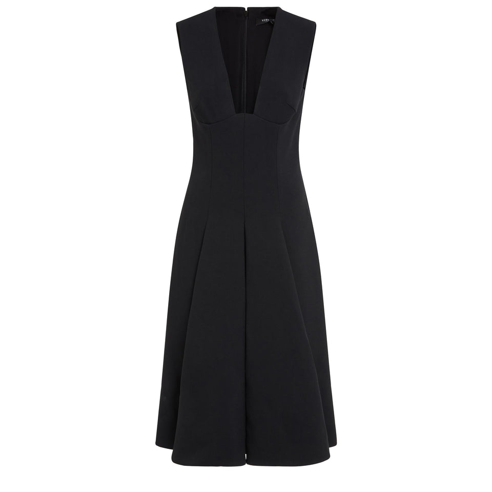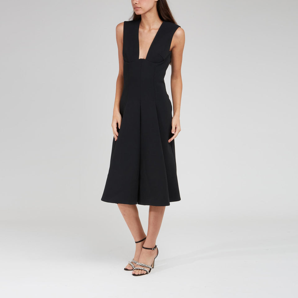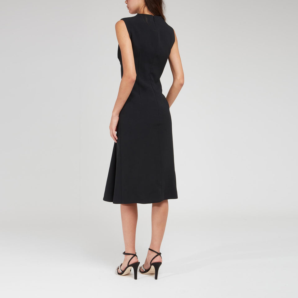 Sleeveless midi dress in fabric with wide V-neck, pleat detail and back zip closure.