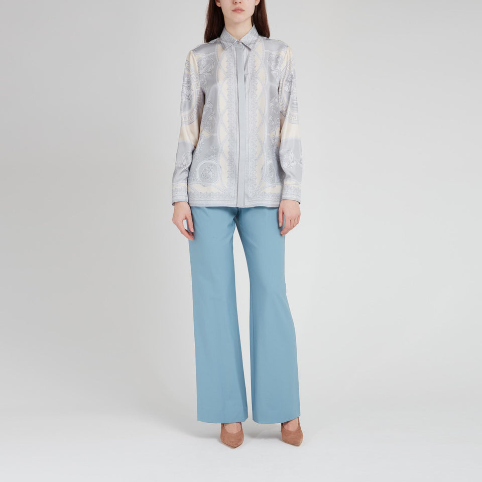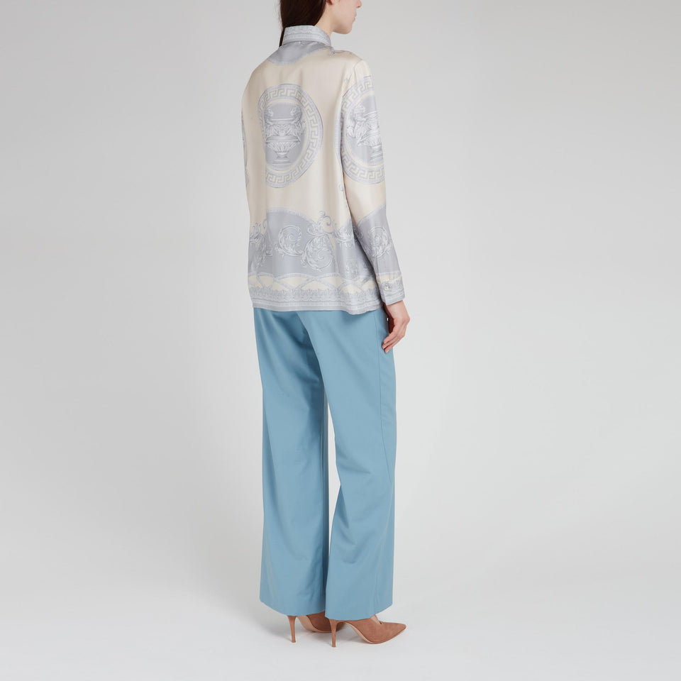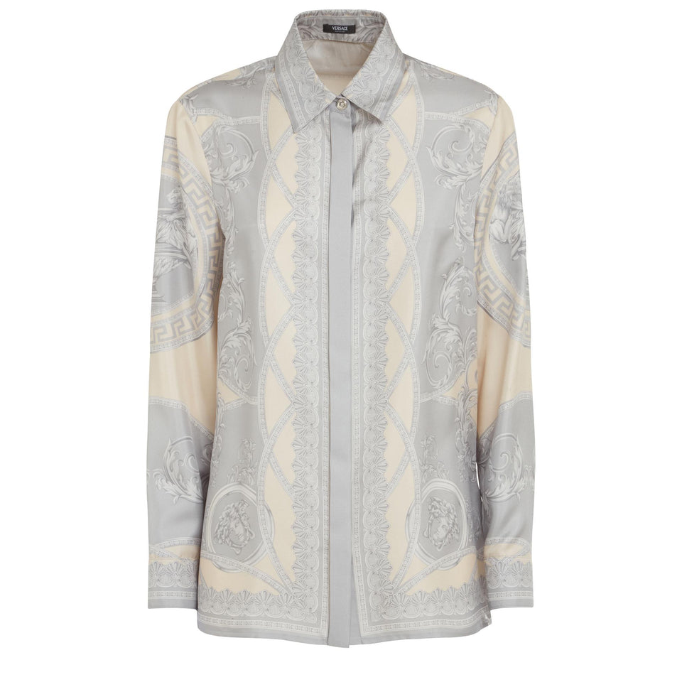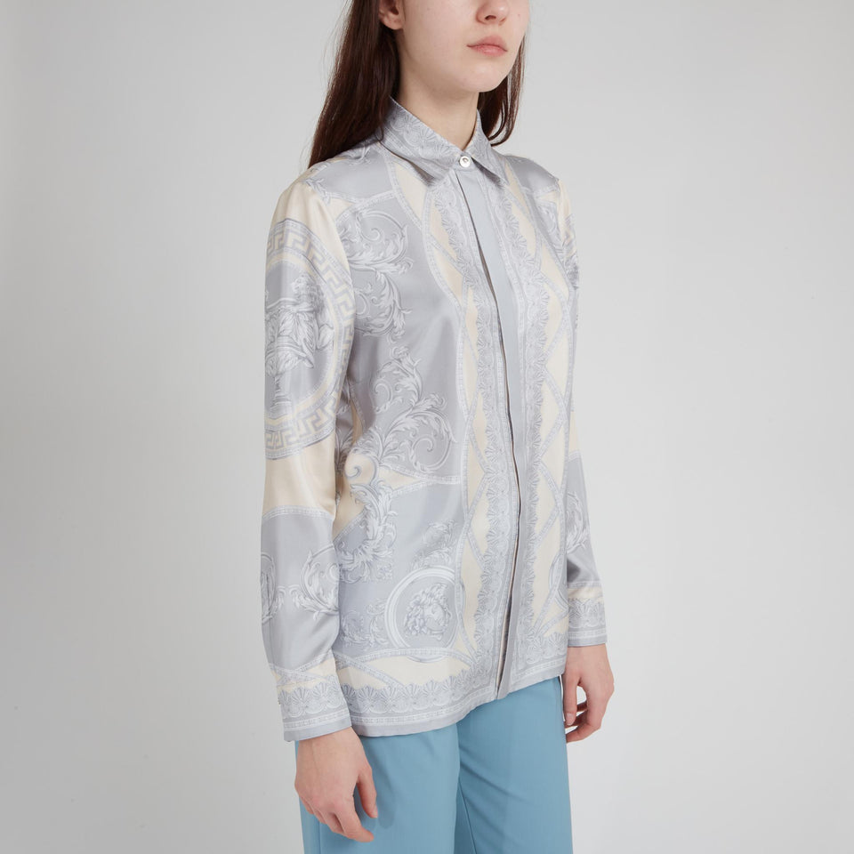 ''La Coupe Des Dieux'' silk shirt with long sleeves and collar, all-over multicolour pattern and concealed front fastening.