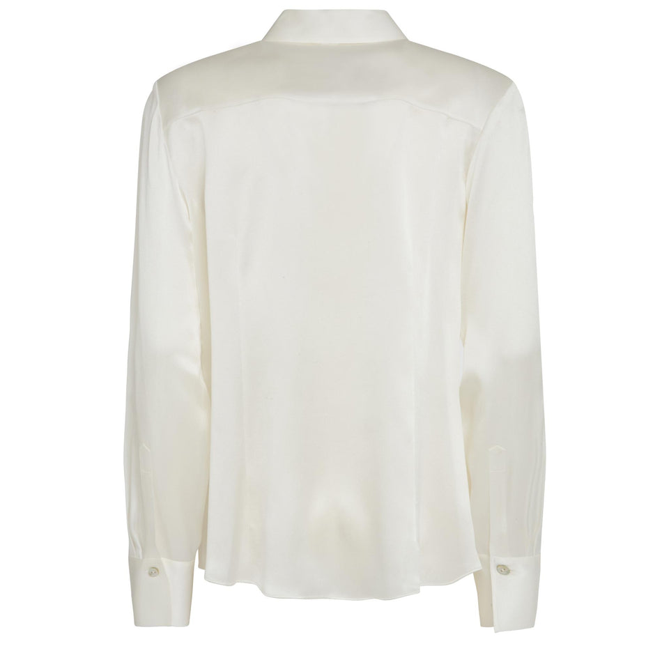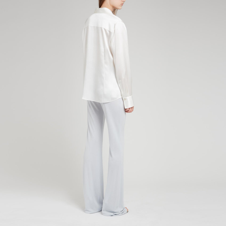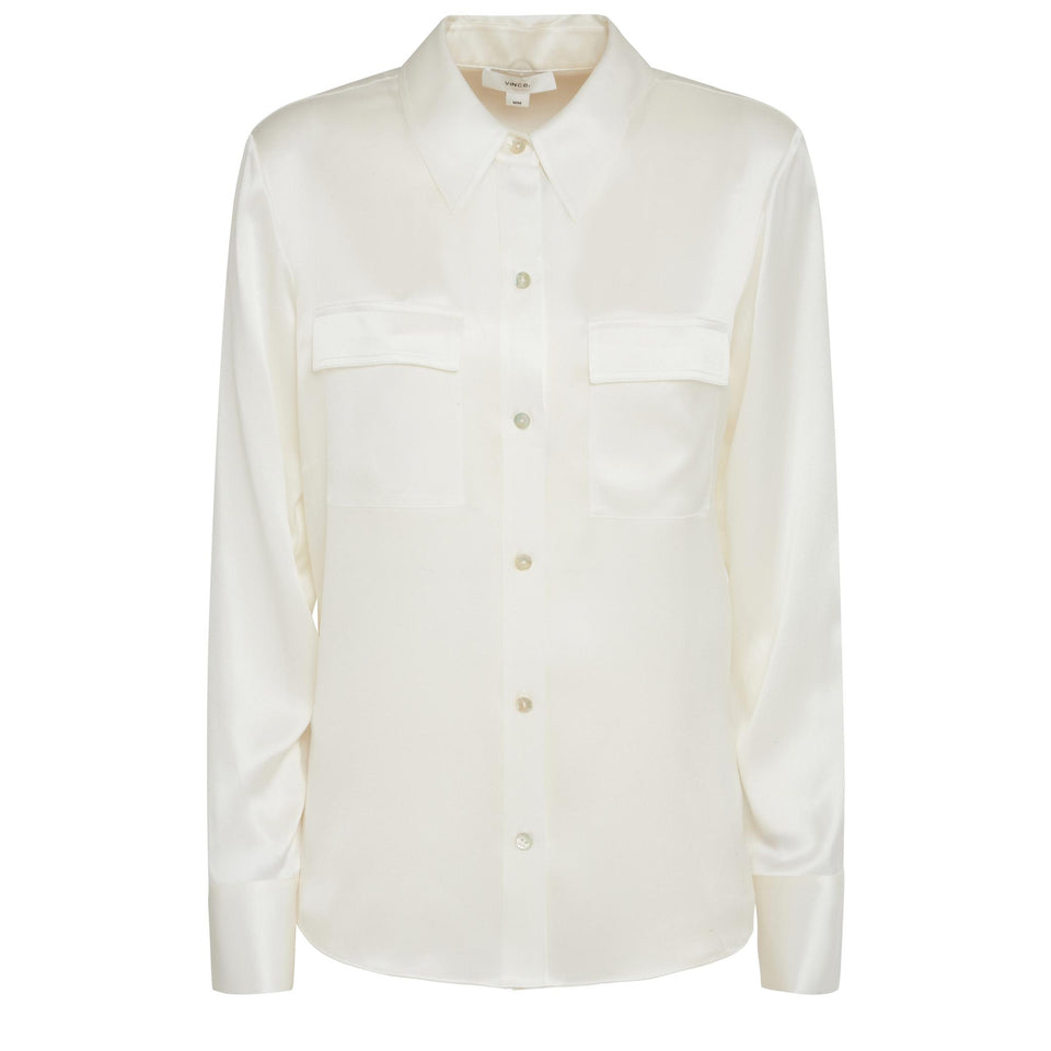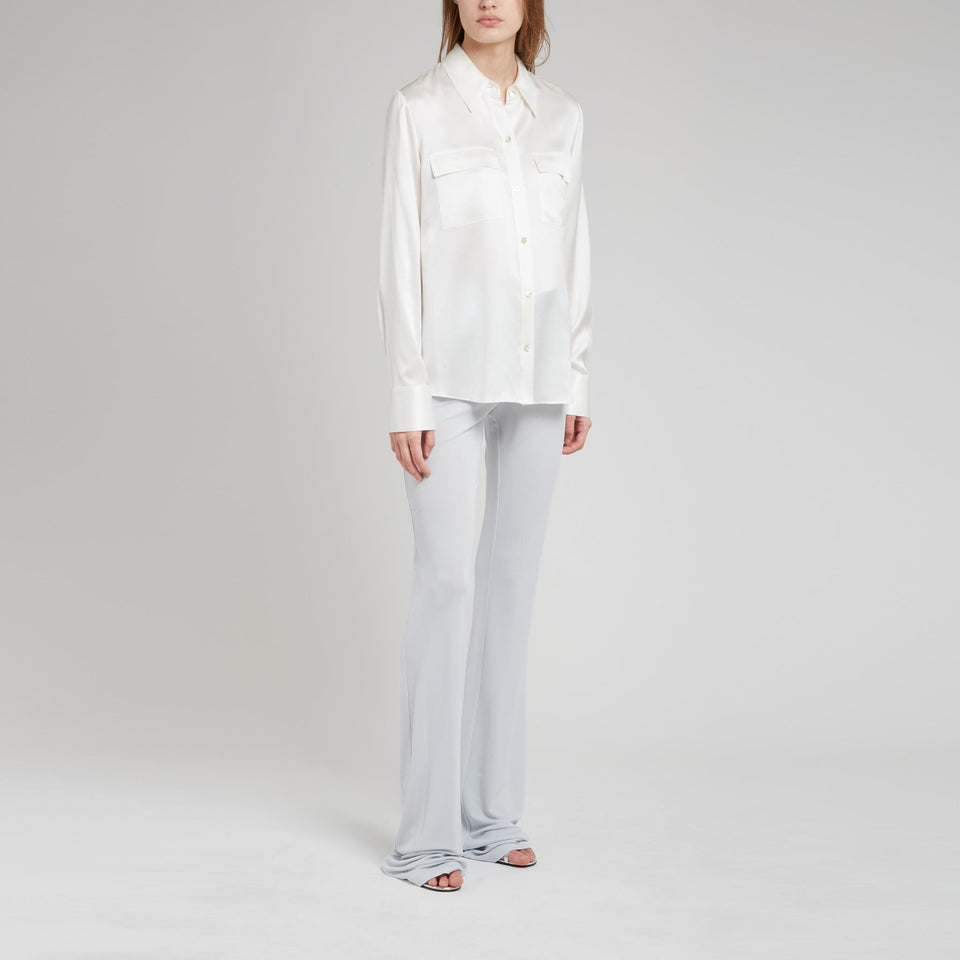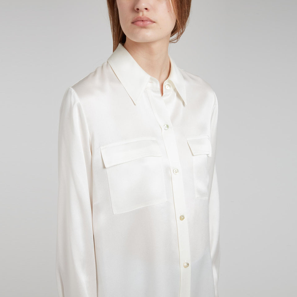Silk shirt with long sleeves and collar, two front flap pockets and six-button front closure.