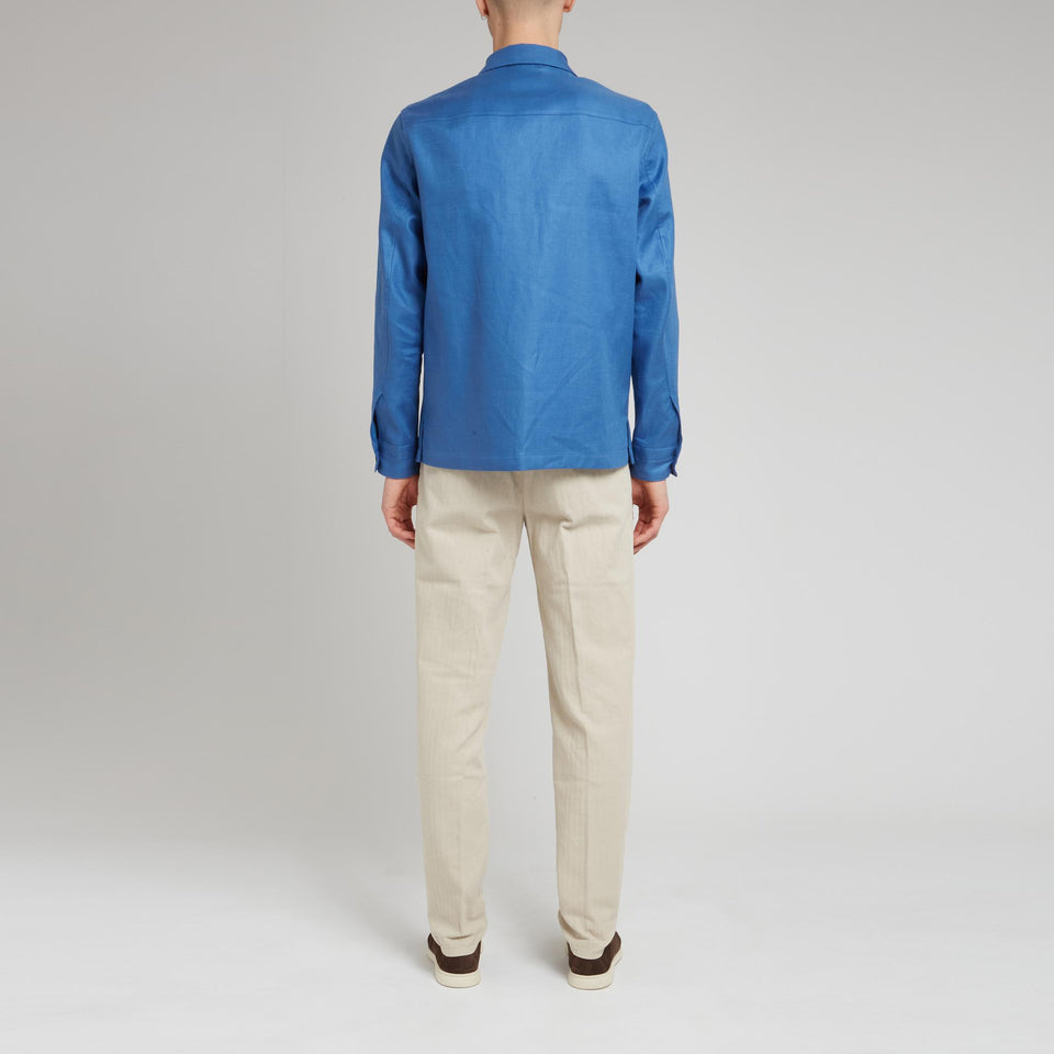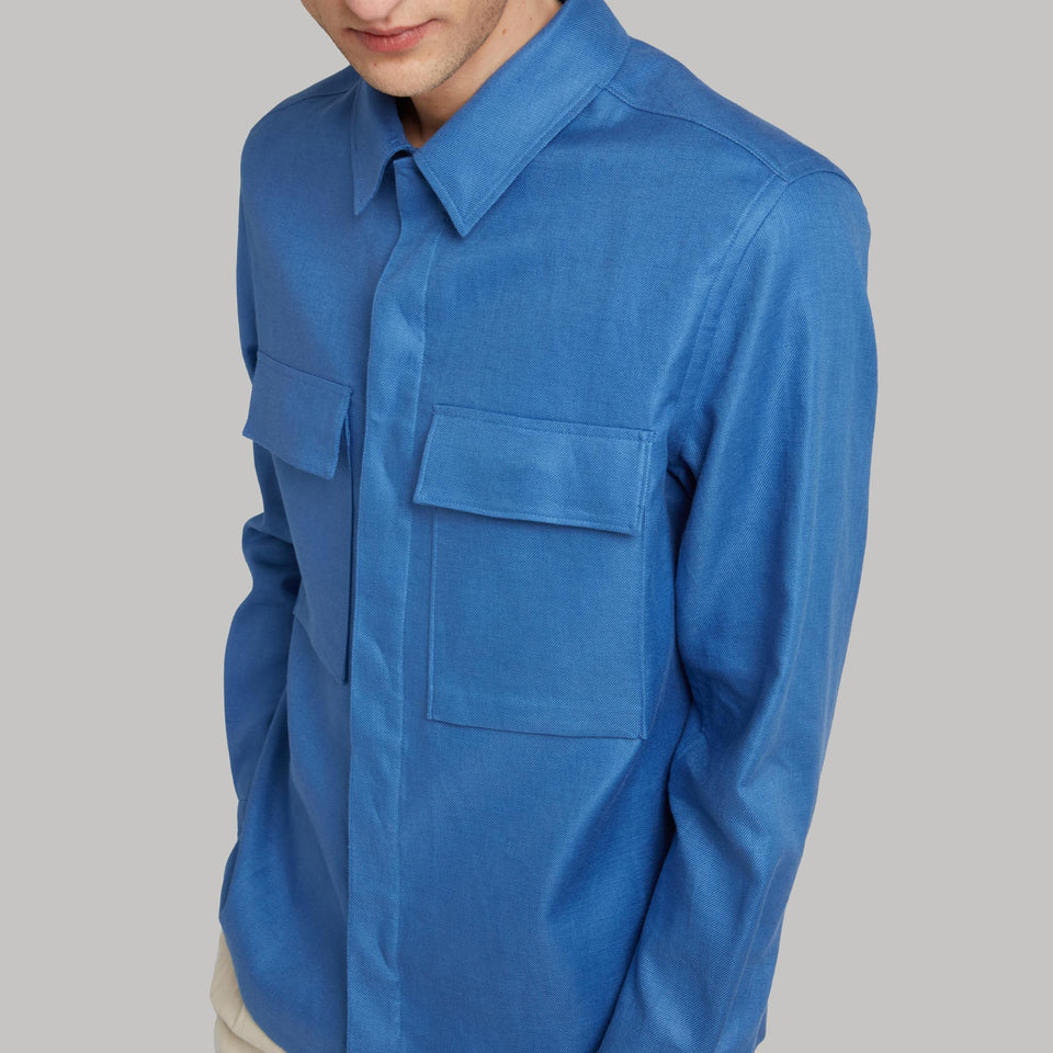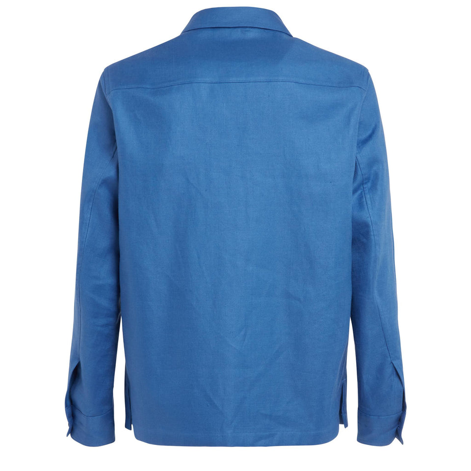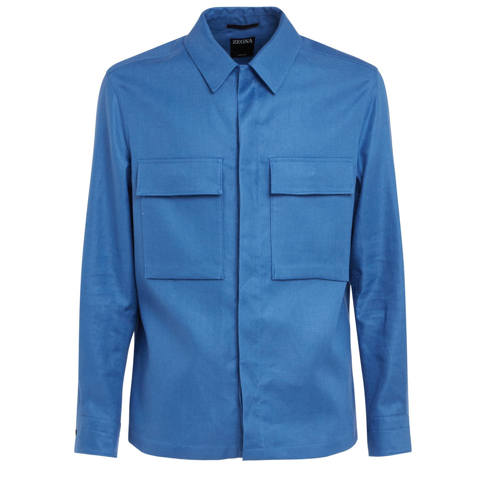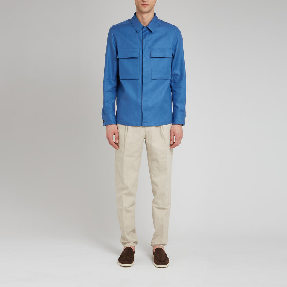 Cotton shirt with long sleeves and collar, two front pockets and concealed front closure.