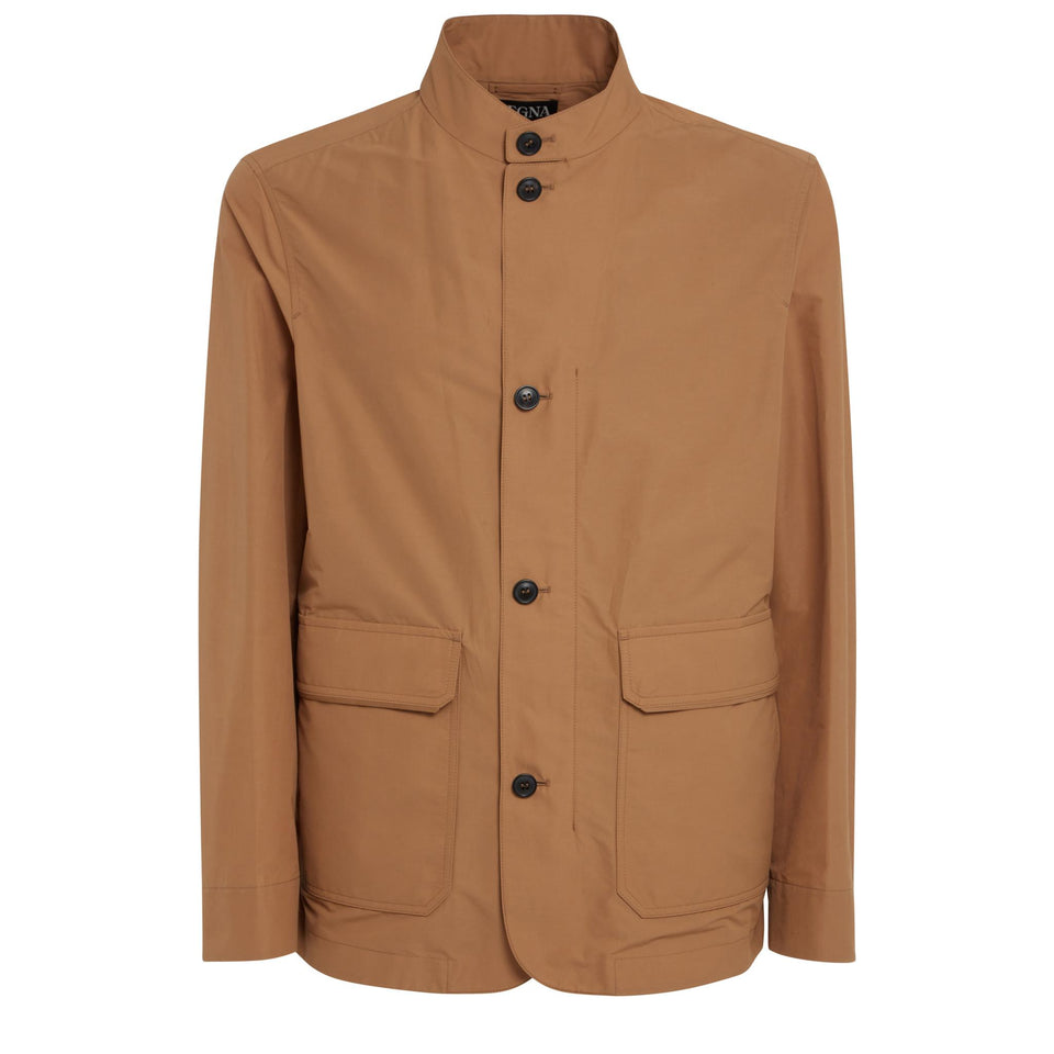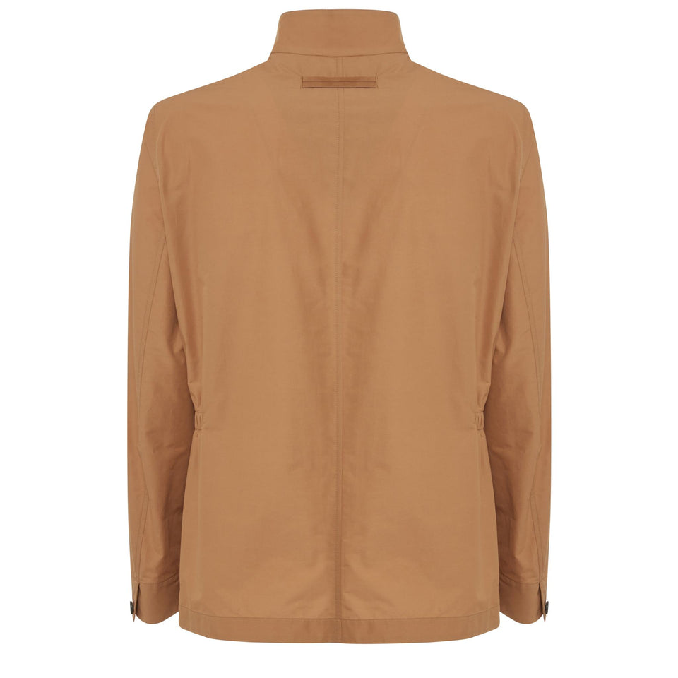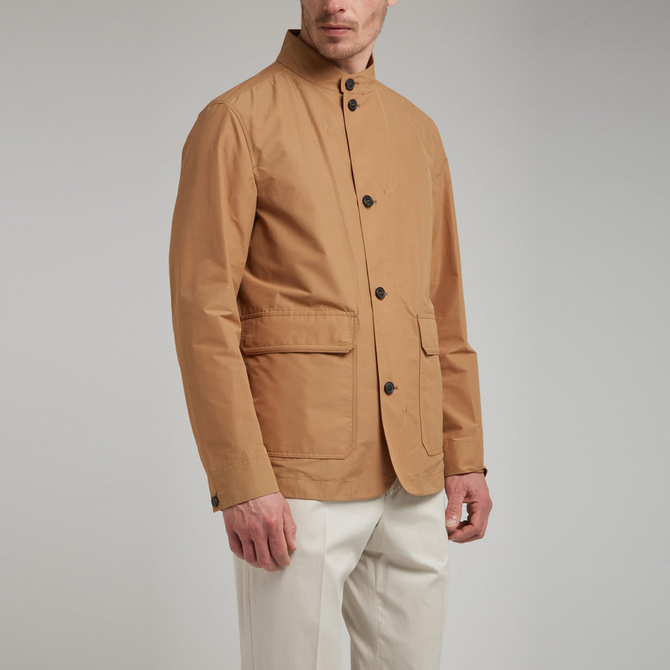 Cotton jacket with long sleeves and high collar, two side pockets with flap and five-button front closure.