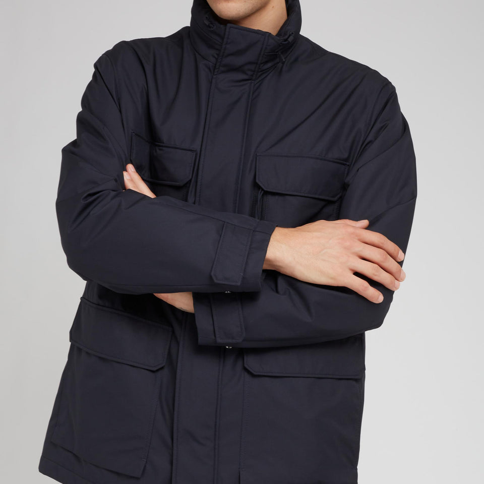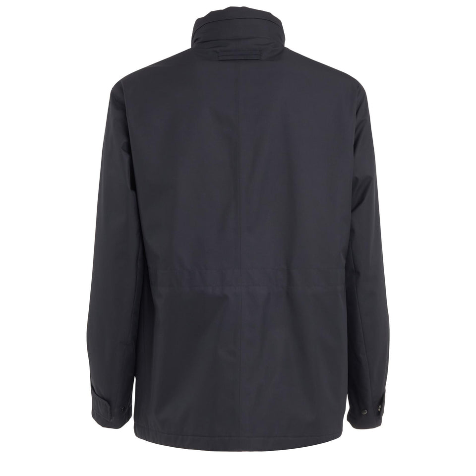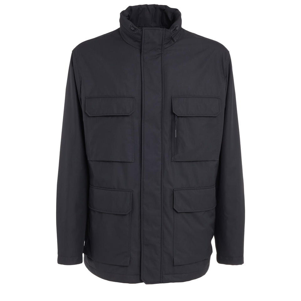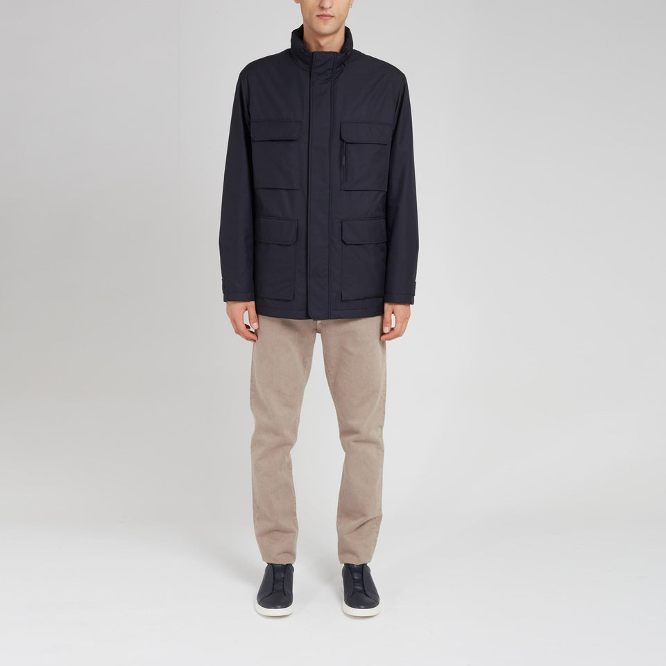 Fabric jacket with long sleeves and high collar, four front pockets with flap and concealed zip closure.