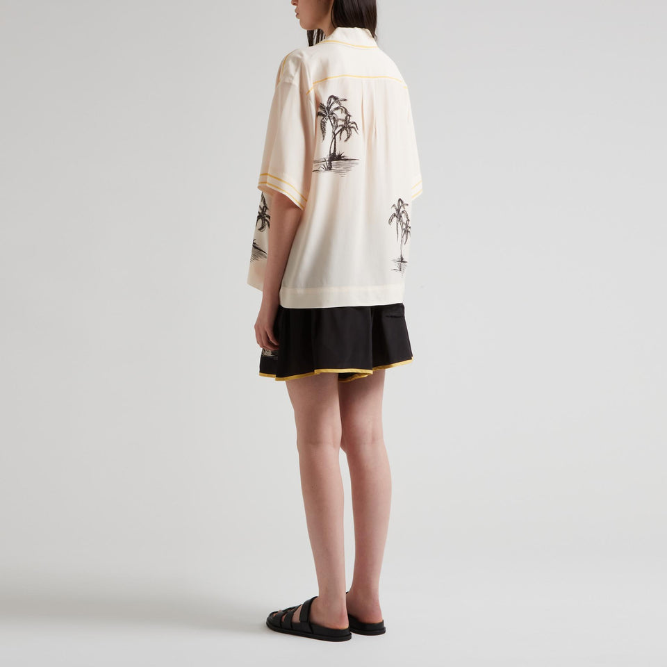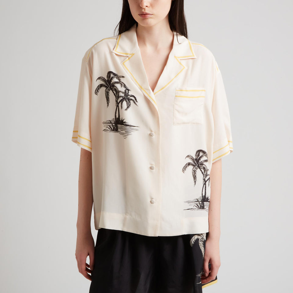 Silk shirt with short sleeves and Cuban collar, front button closure.