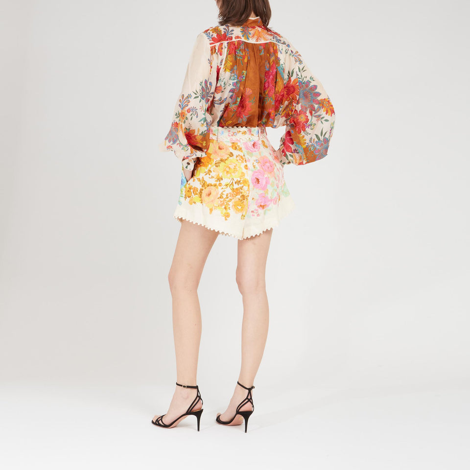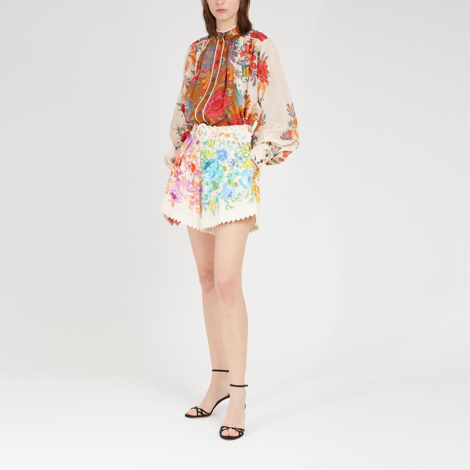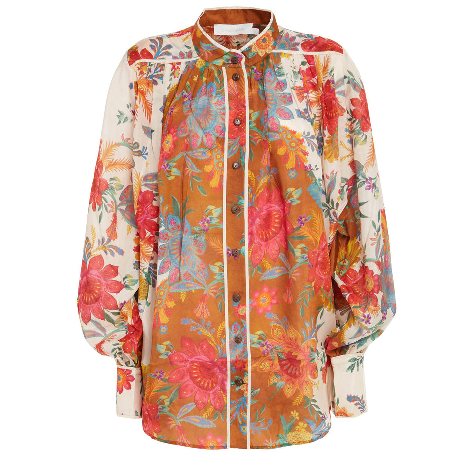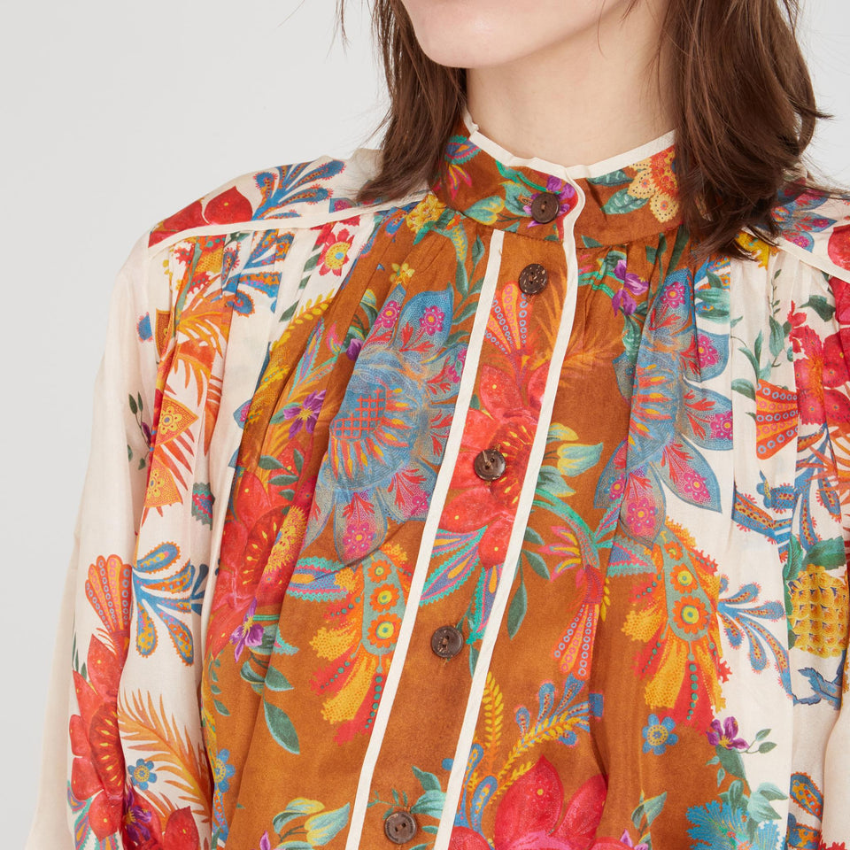 Silk shirt with wide long sleeves and Korean collar, all over multicolor floral pattern and front closure with buttons.